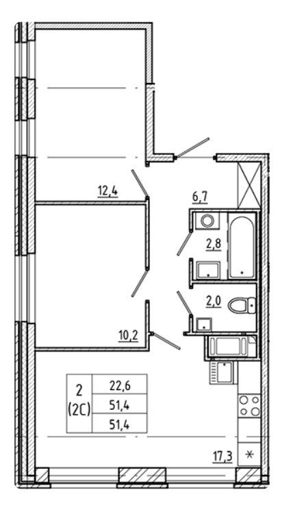 Общая площадь 51.4 м2