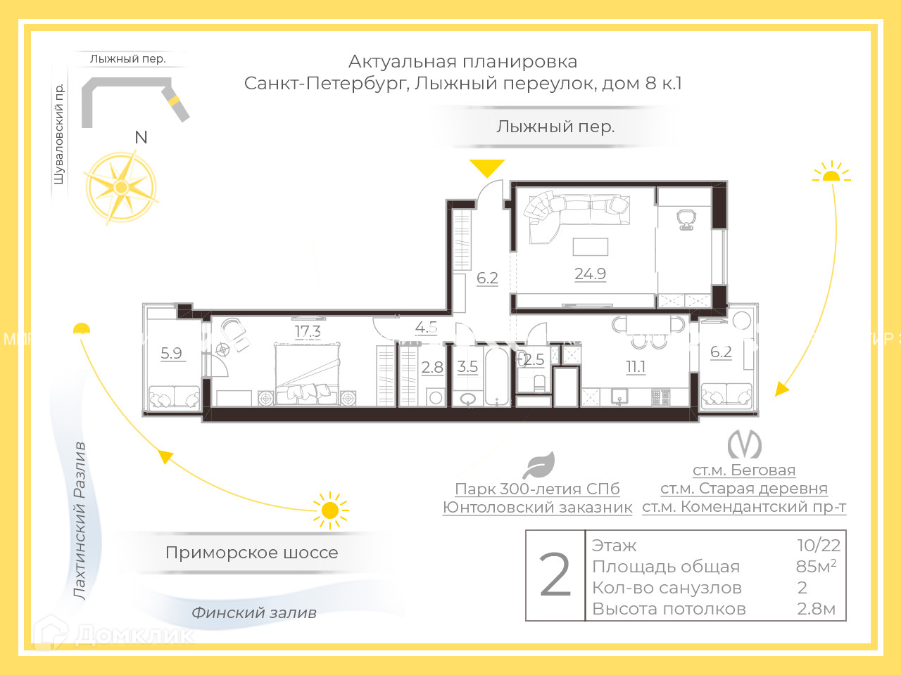 2-комнатная квартира, 85 м2, этаж 10 / 22, на продажу в Санкт-Петербурге, Лыжный переулок, 8к1