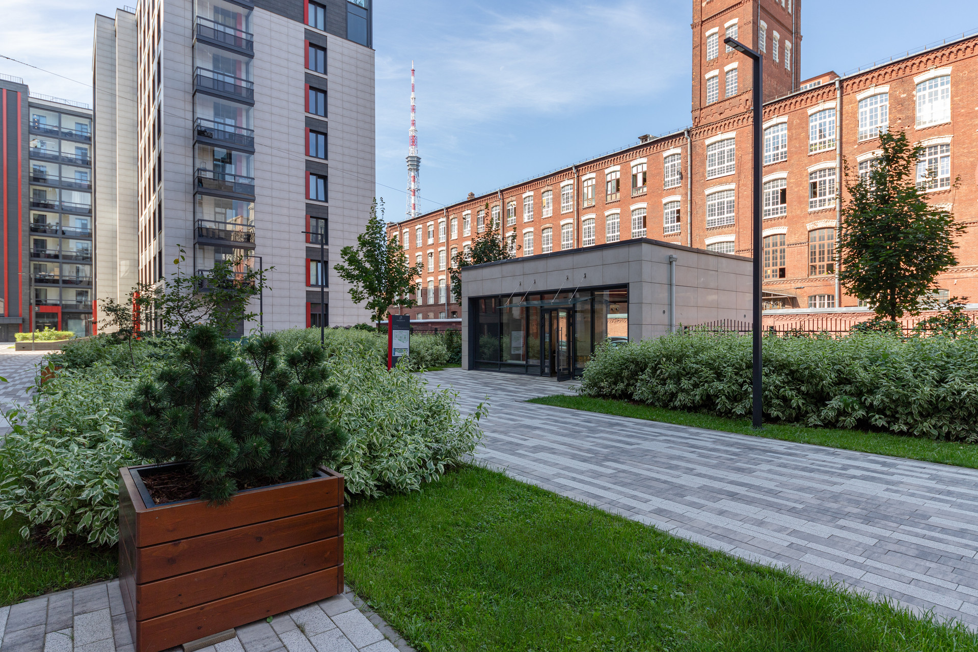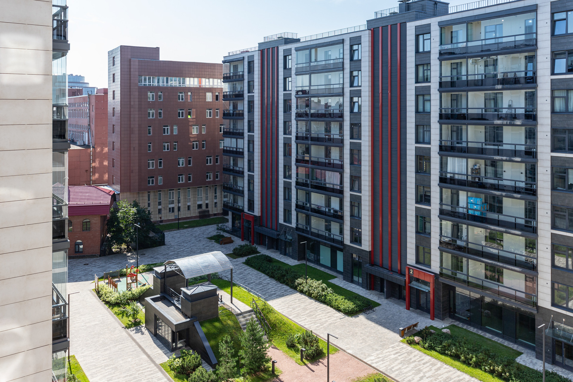 - благоустройство: закрытый двор без машин, безбарьерная среда, отдельные места для отдыха взрослых, спортивные и детские зоны, ландшафтное озеленение и геопластика,