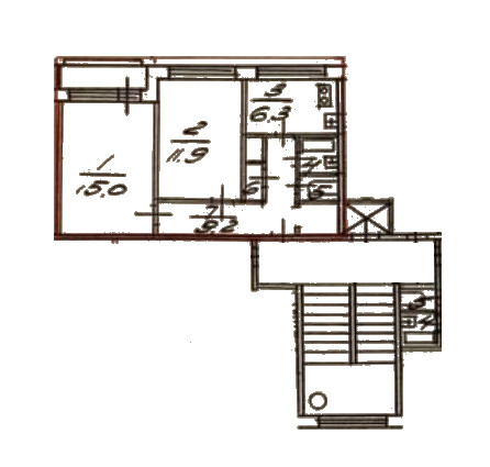 - Общая площадь квартиры 45,8 кв.м. Изолированные комнаты 15,0 и 11,9 кв.м. Кухня 6,3 кв.м.
