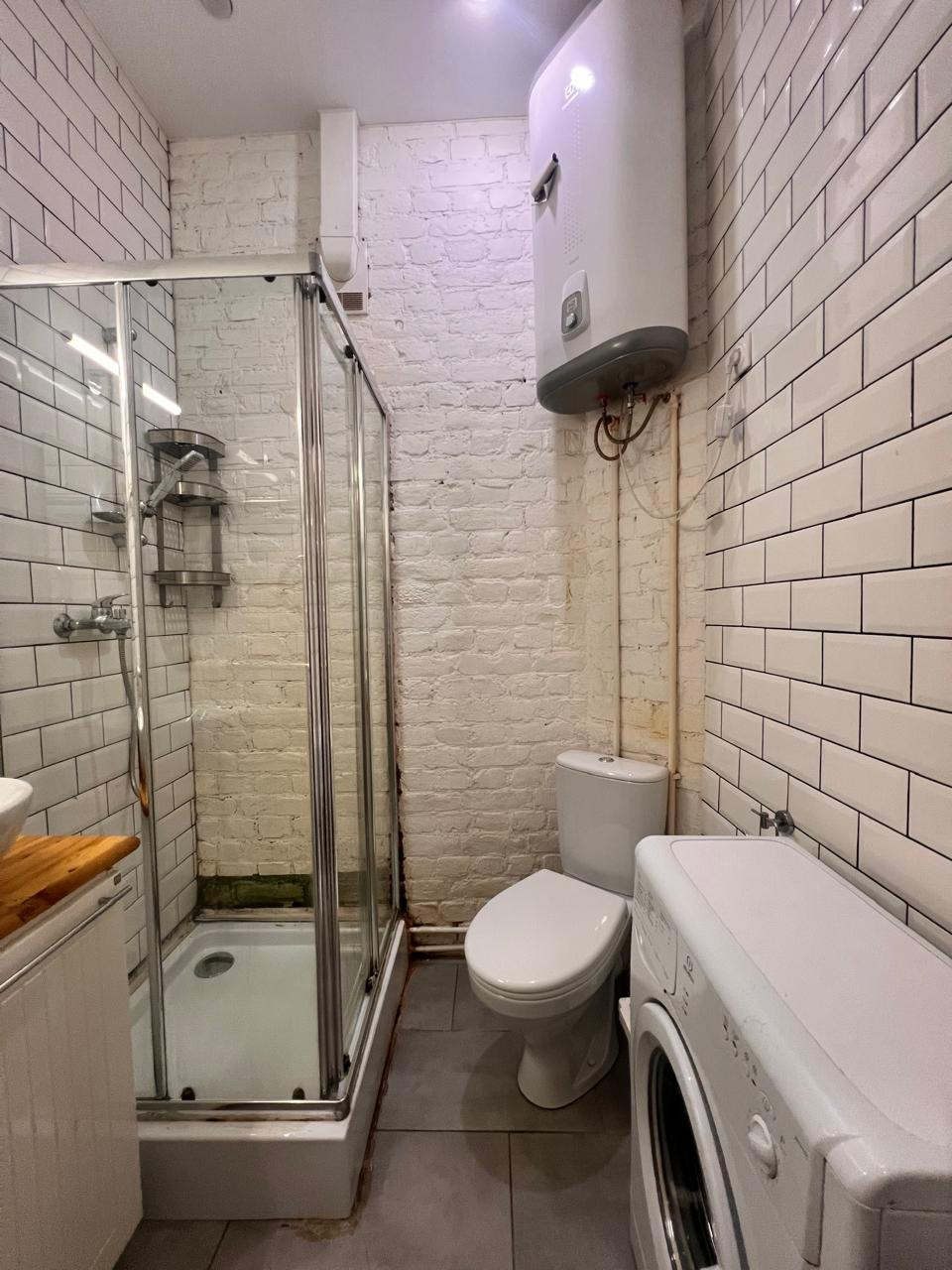 Совмещенный санузел с душевой кабиной и бойлером.