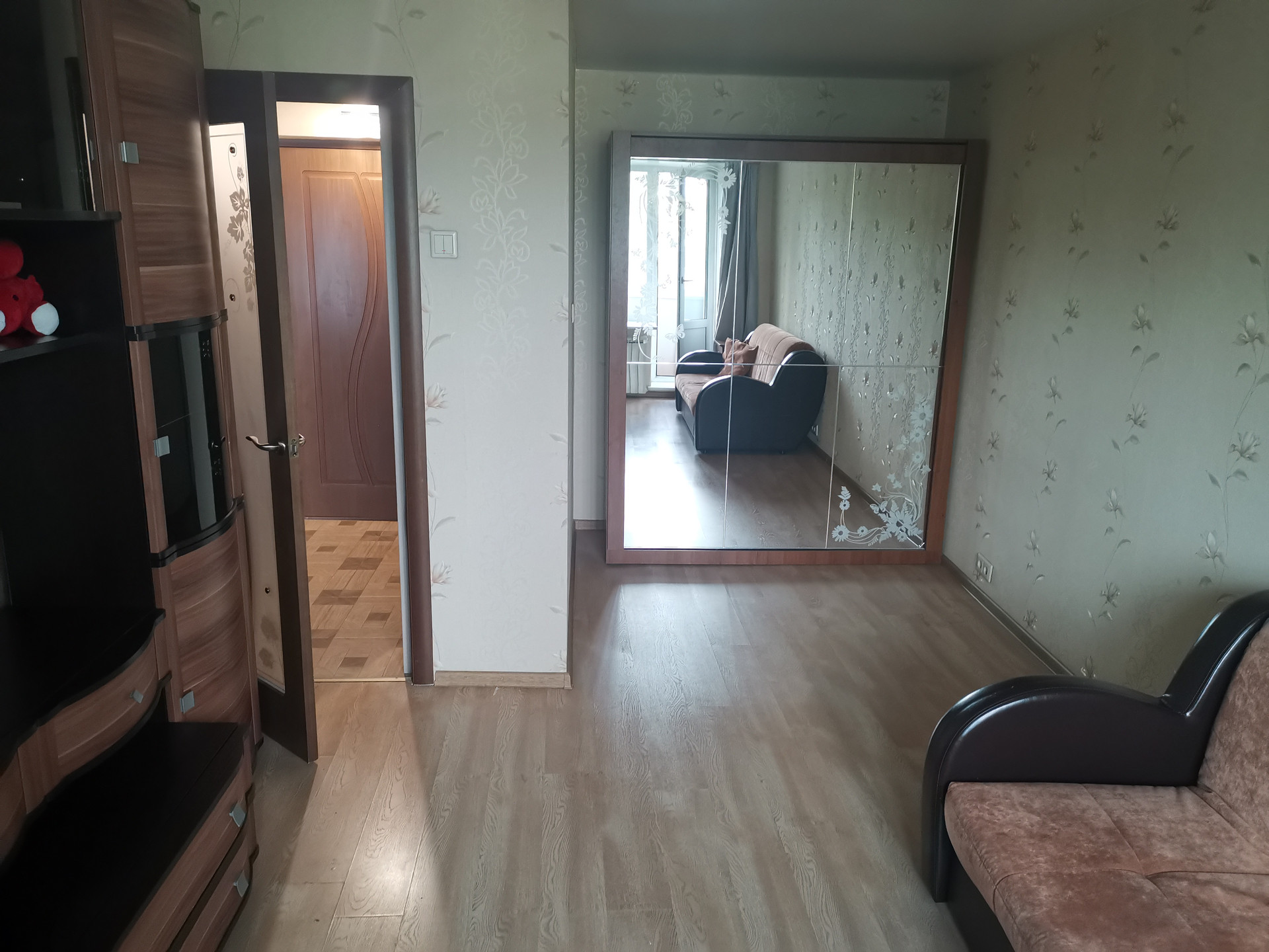 Возможна продажа со всей мебелью и техникой, что на фото (кровать, диван, стенка в комнате и шкаф в прихожей, кухонный гарнитур, кухонный уголок, плита, холодильник, стиральная машина. Всё в хорошем состоянии.) Кровать с подъемным механизмом - превращается в шкаф, что удобно, когда приходят гости или нужно место для тренировок.