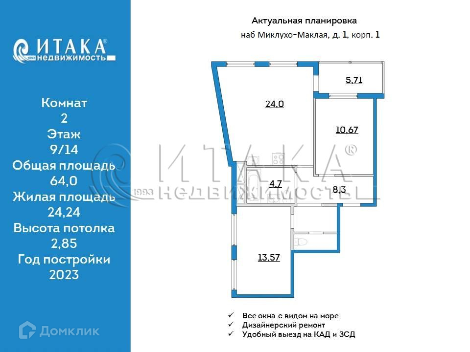 2-комнатная квартира, 64 м2, этаж 9 / 14, на продажу в Санкт-Петербурге, набережная Миклухо-Маклая, 1к1