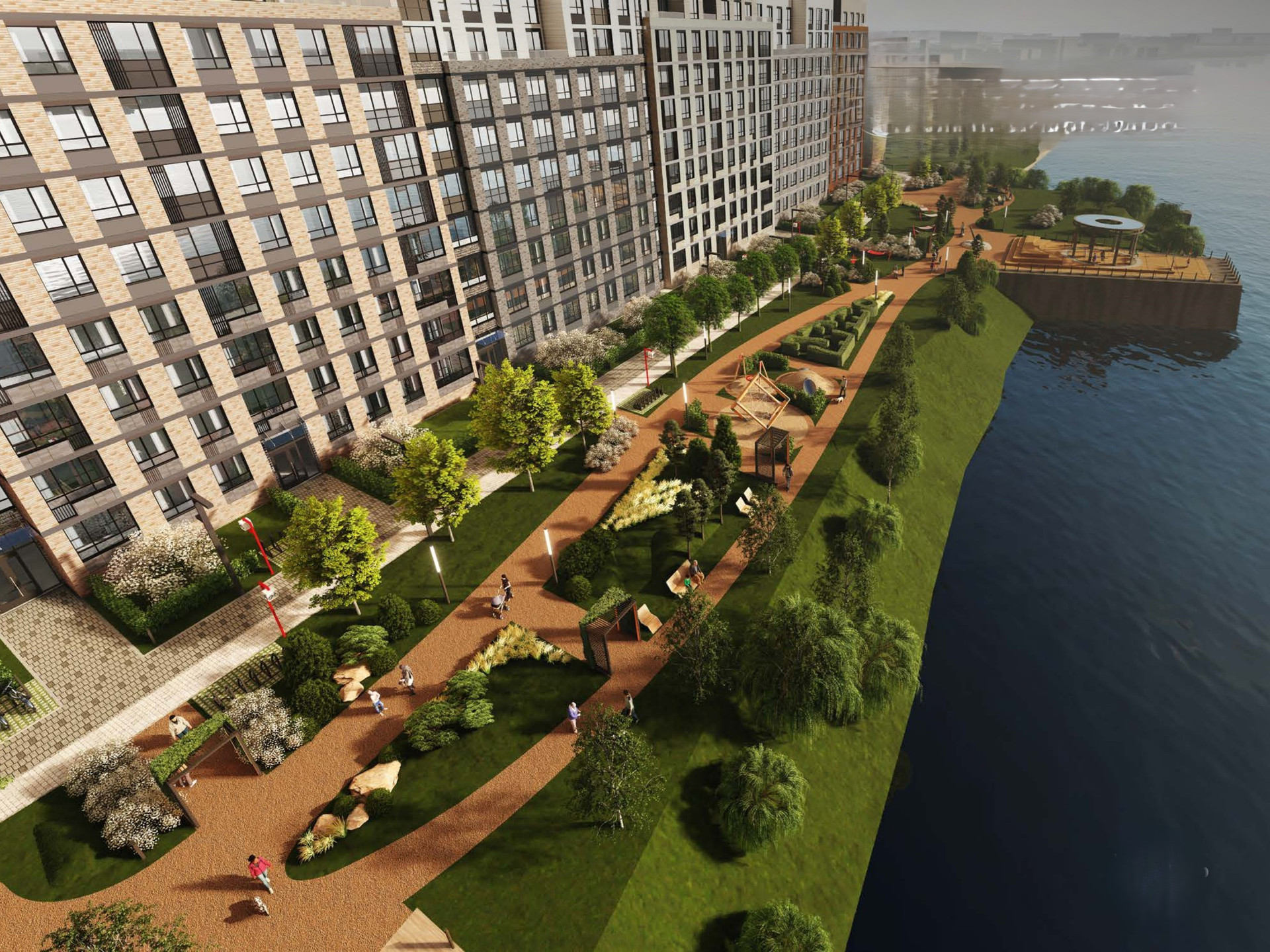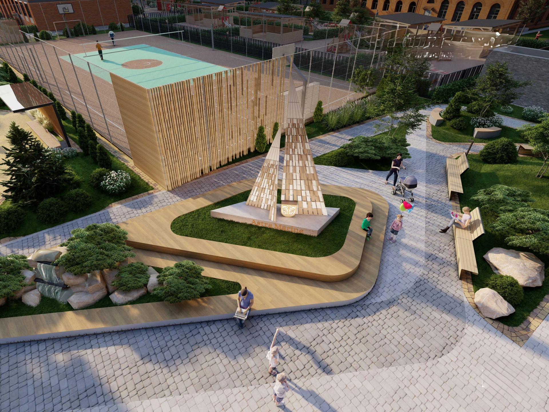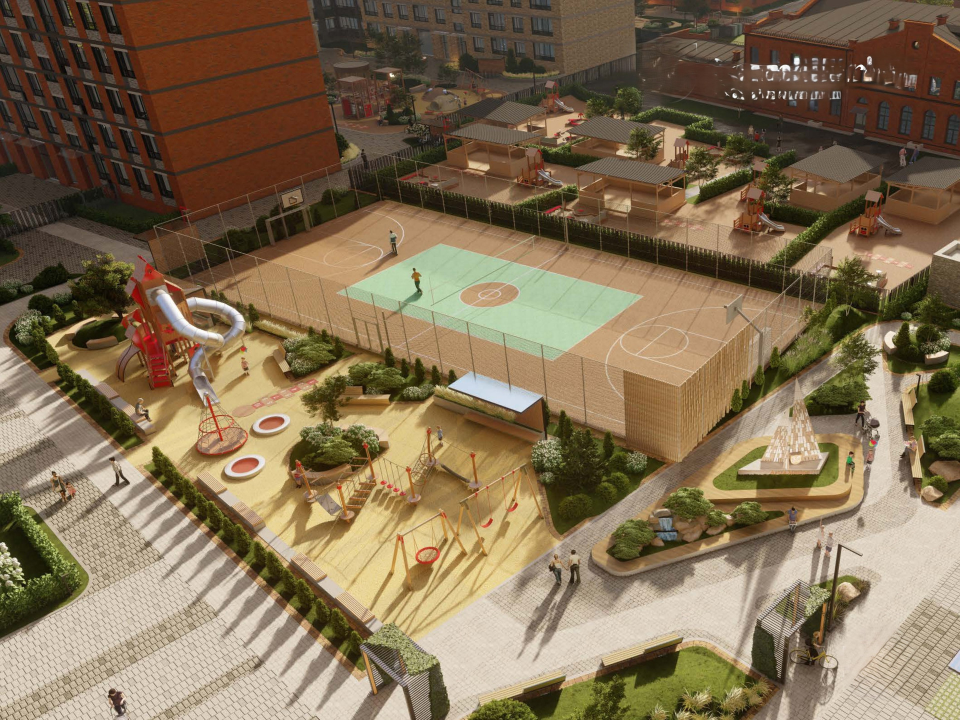 -Большой закрытый двор с детским садом и дворами-патио. -Подземный паркинг на 534 машино-места. -В большом внутреннем дворе располагается детский сад с бассейном на 110 мест, собственными площадками и закрытой территорией, а также большой спортивный стадион.