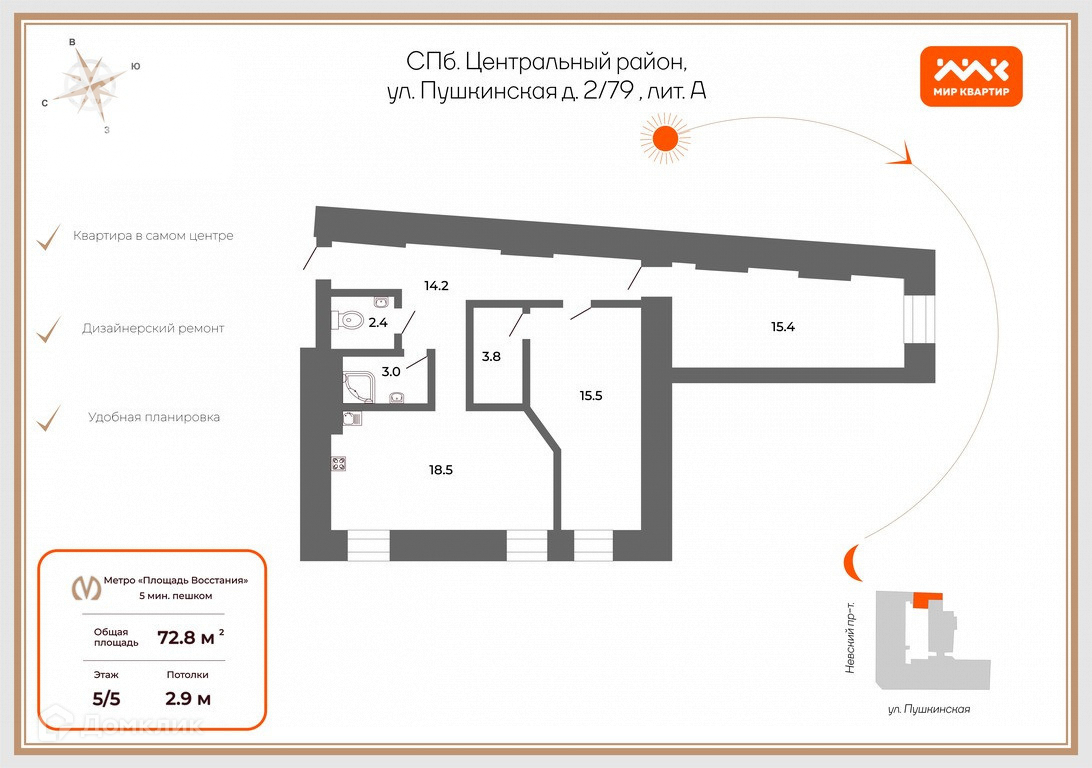 2-комнатная квартира, 72.8 м2, этаж 5 / 6, на продажу в Санкт-Петербурге, Невский проспект, 79
