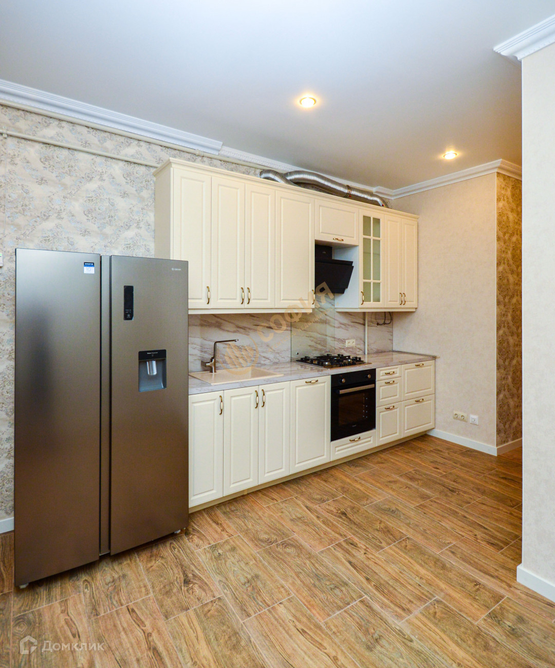 Квартира на 6 этаже, окна выходят во двор, на Северо-Восток. Общая площадь 77.5 м2, комнаты: 13,2 м2 +18,3 м2, две гардеробные, просторная кухня 15,4 м2, санузел раздельный. Камин. В квартире два входа.  Выполнен качественный ремонт.