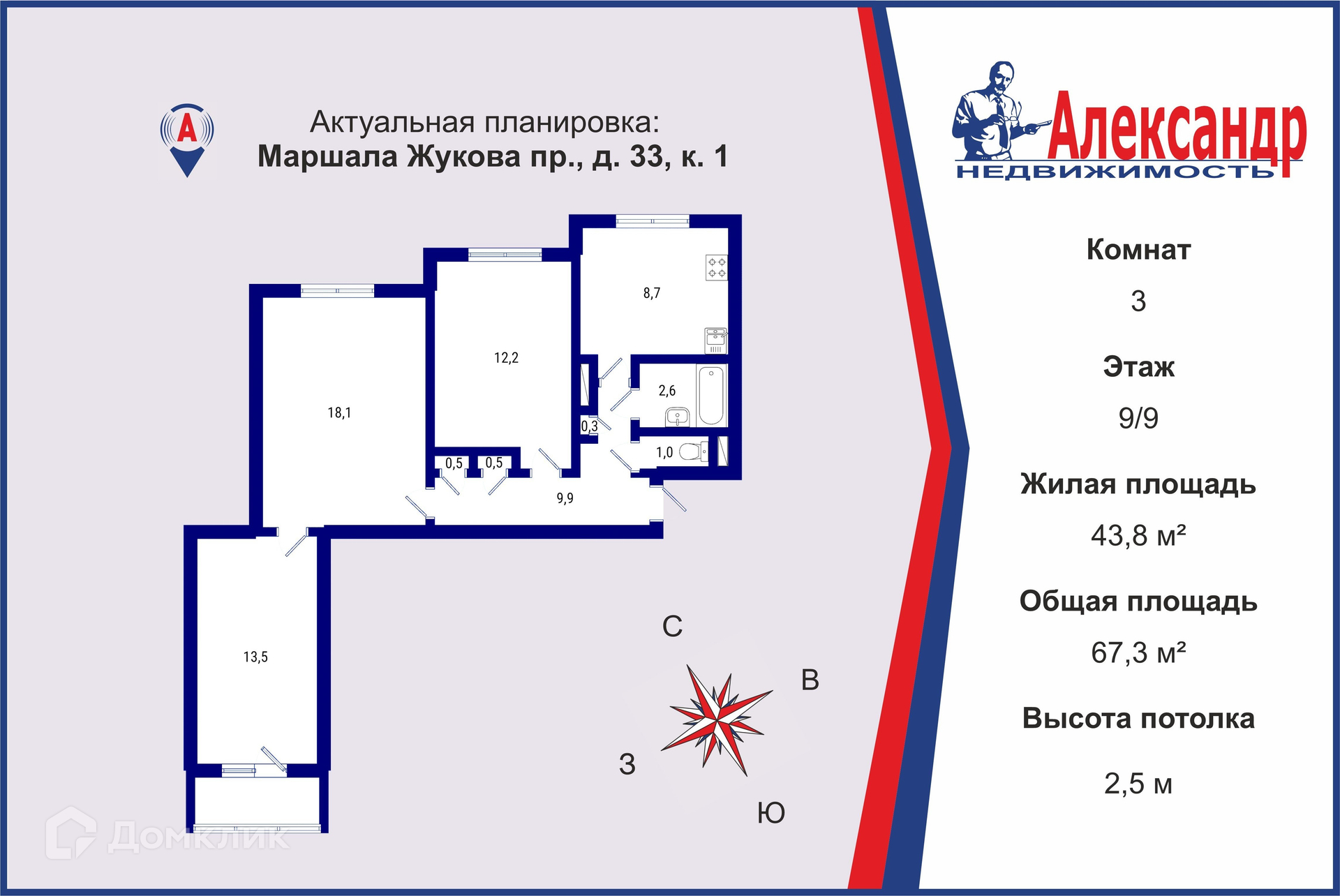 3-комнатная квартира, 67.3 м2, этаж 9 / 9, на продажу в Санкт-Петербурге, проспект Маршала Жукова, 33к1