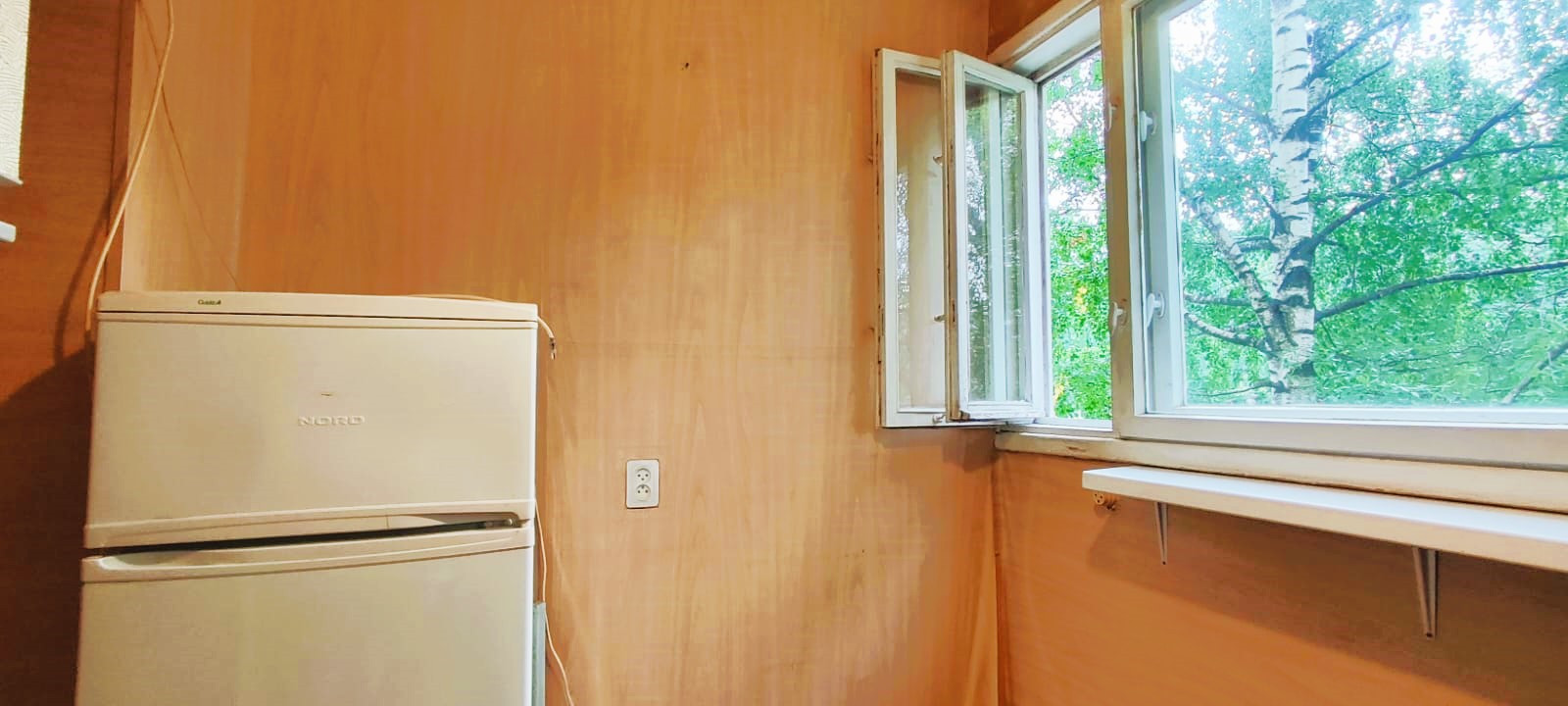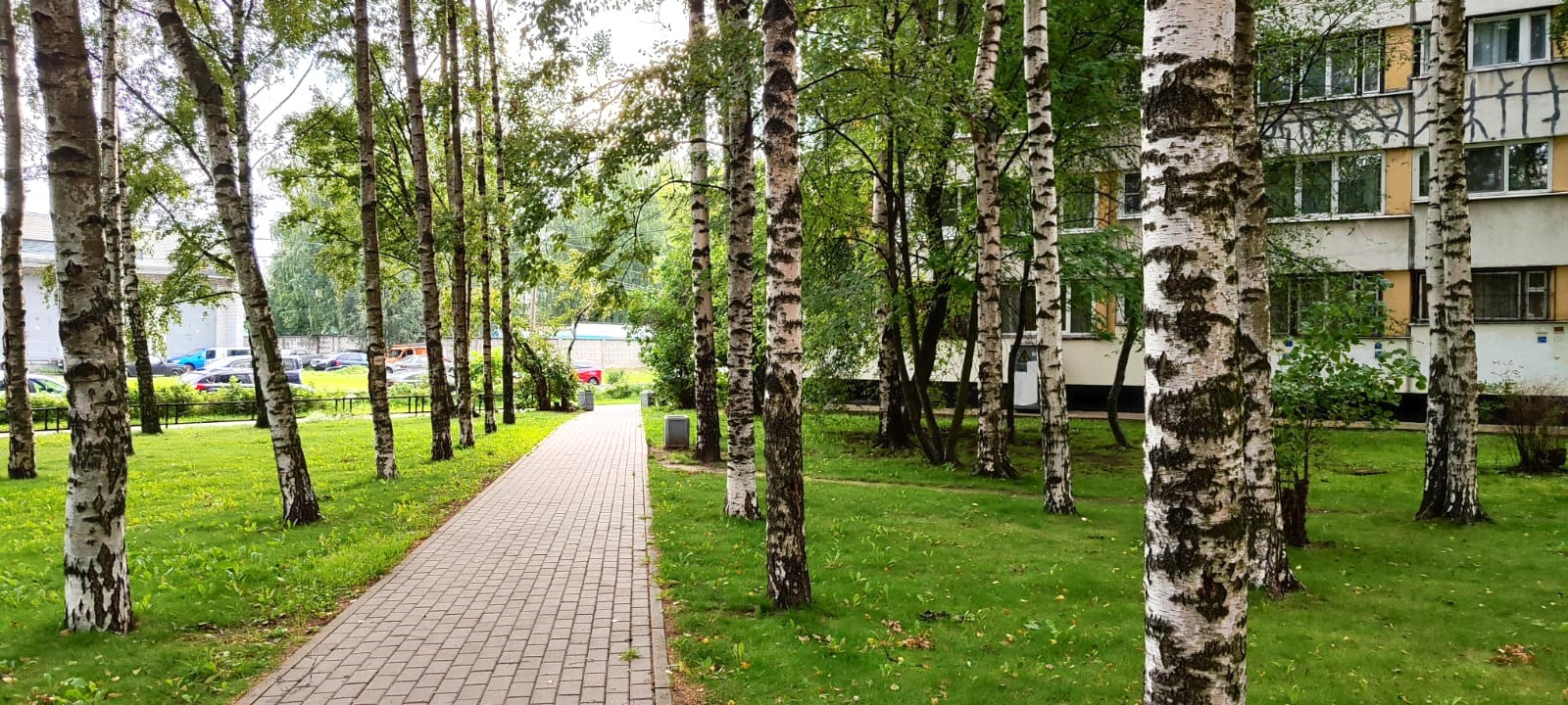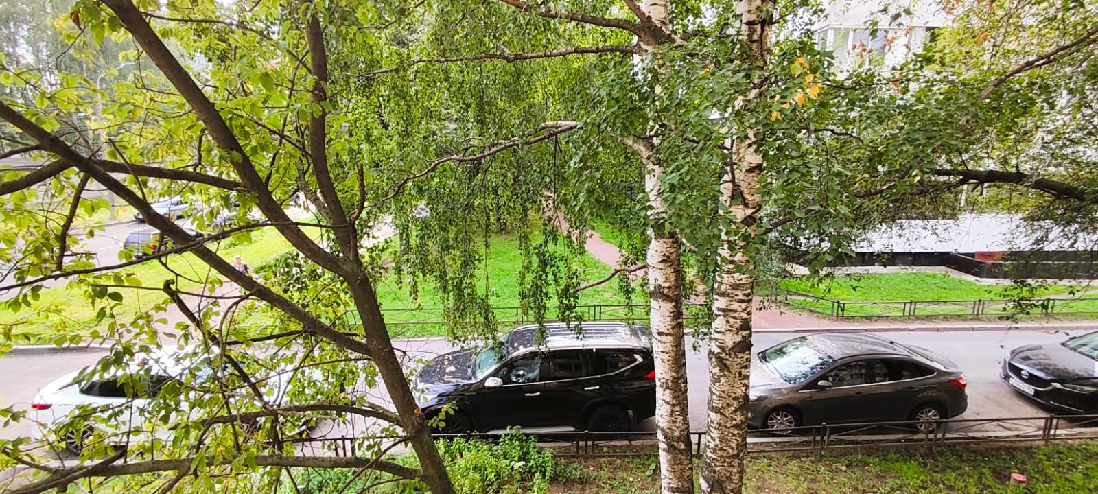 Вид из окон в тихий зеленый двор, где есть своя небольшая березовая роща.