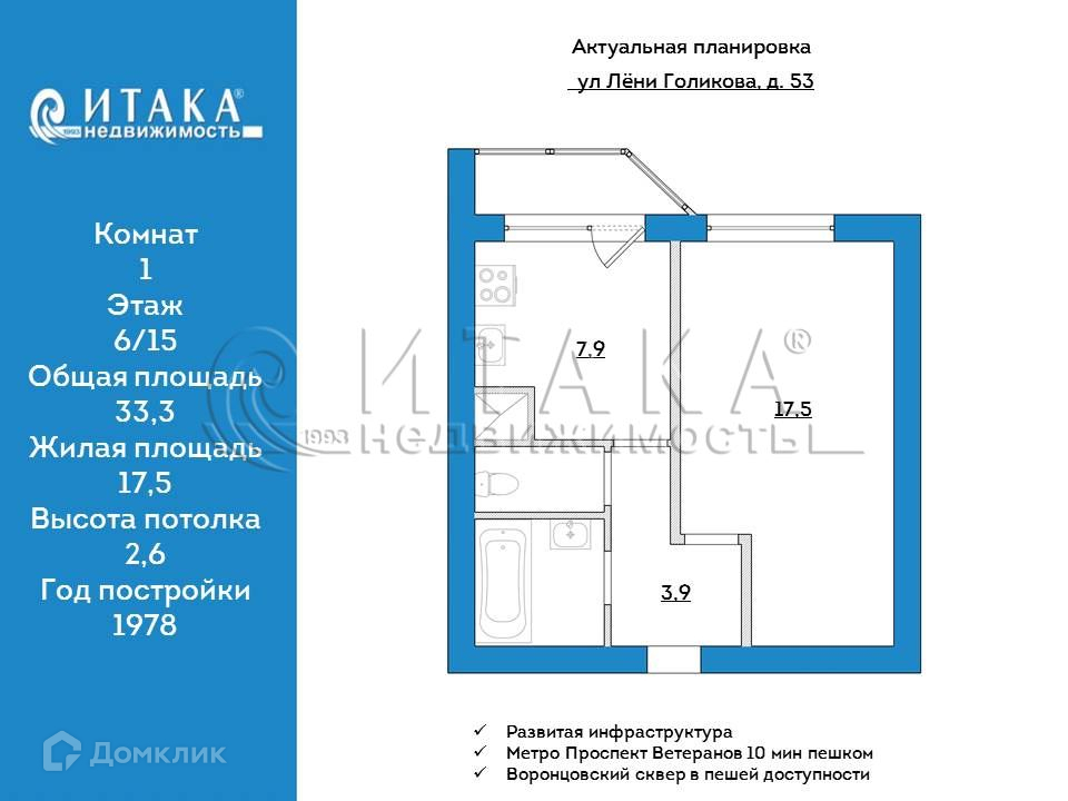 • Площадь квартиры 33,3 кв.м: кухня - 7,9 кв.м, комната - 17,5 кв.м; коридор - 3,9 кв.м.