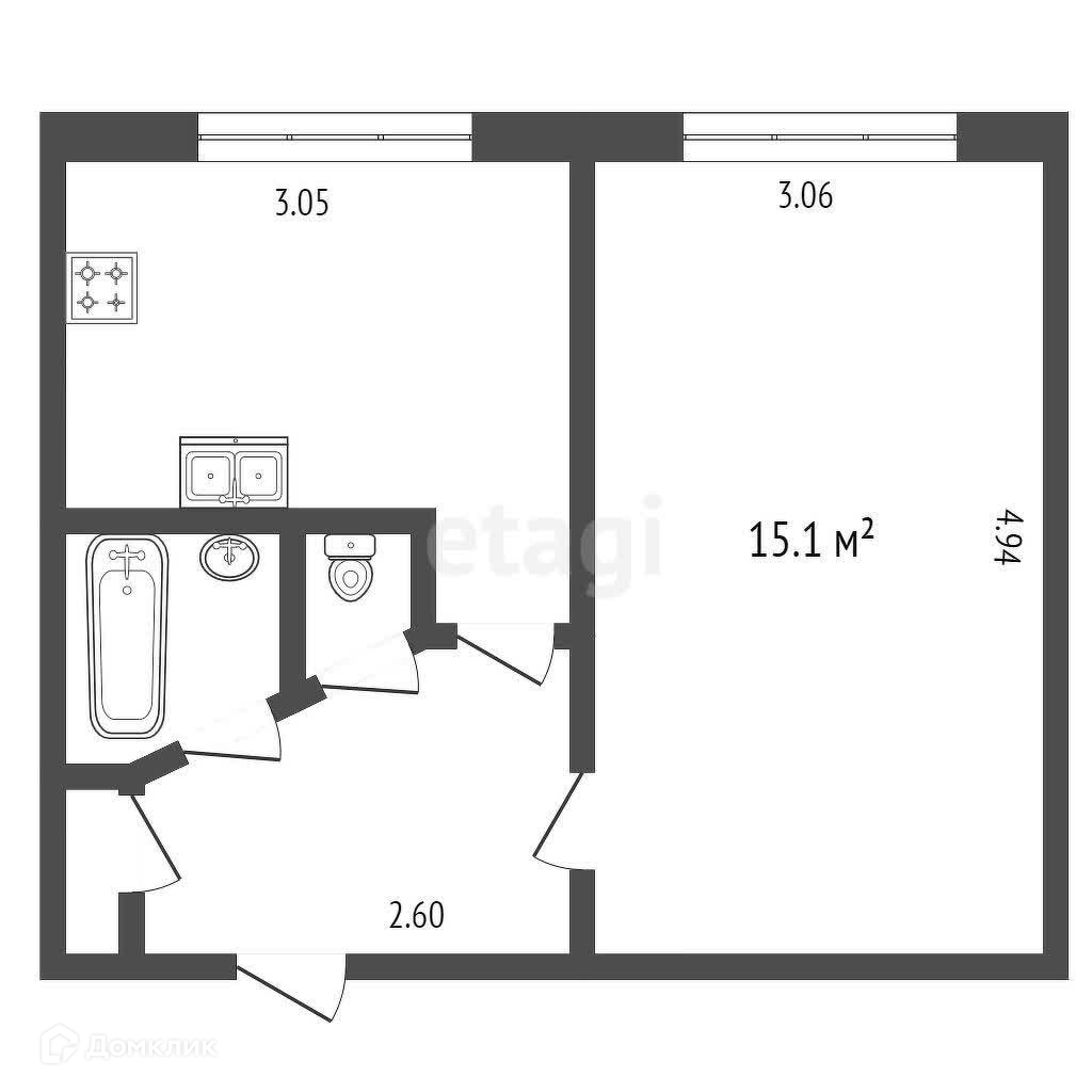 Площадь комнаты 15,1 кв.м., кухня 6,6 кв.м.