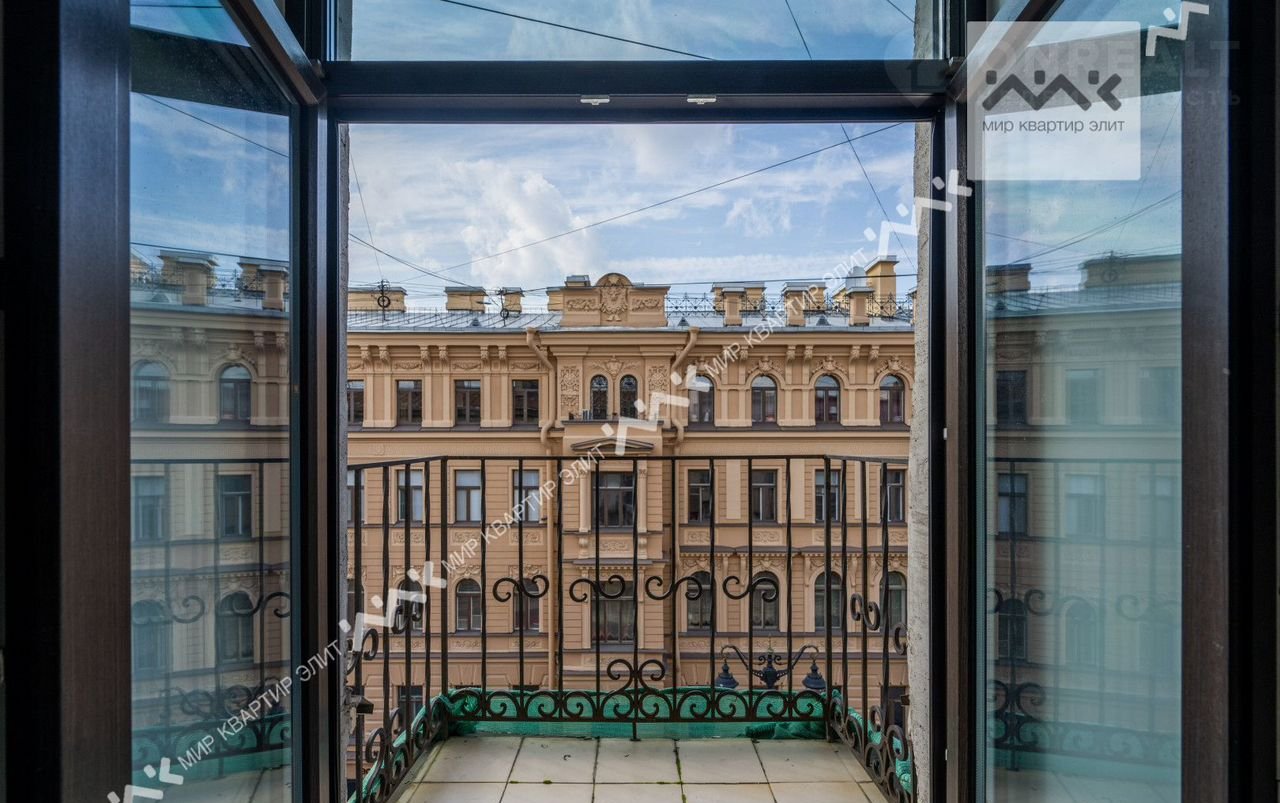 Квартира двусторонняя, окна гостиной выходят на улицу Рубинштейна и в красивый большой двор с видом на купол собора.