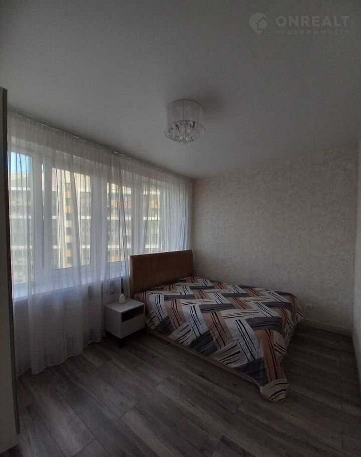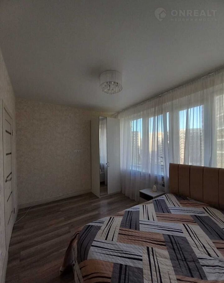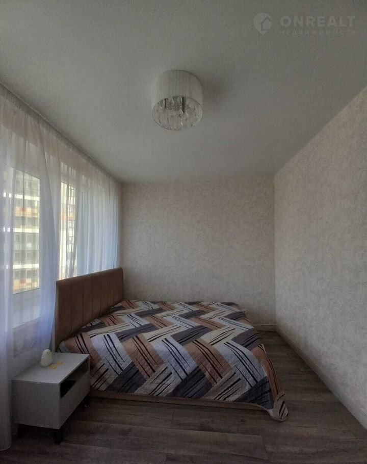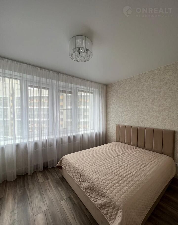 На фото одной из комнат представлено возможное расположение кровати - форма комнаты позволит установить кровать в любом направлении.