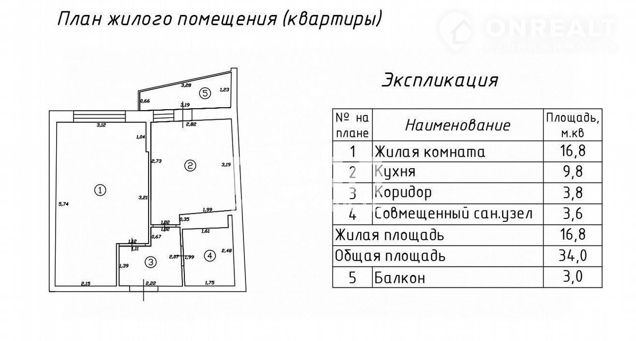 Общая площадь квартиры 34,0 кв.м., комната 16,8, кухня - 9,8.