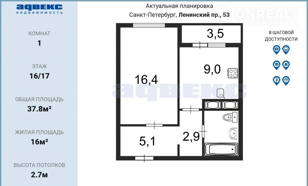 1-комнатная квартира, 38 м2, этаж 16 / 17, на продажу в Санкт-Петербурге, Ленинский проспект, 53к2