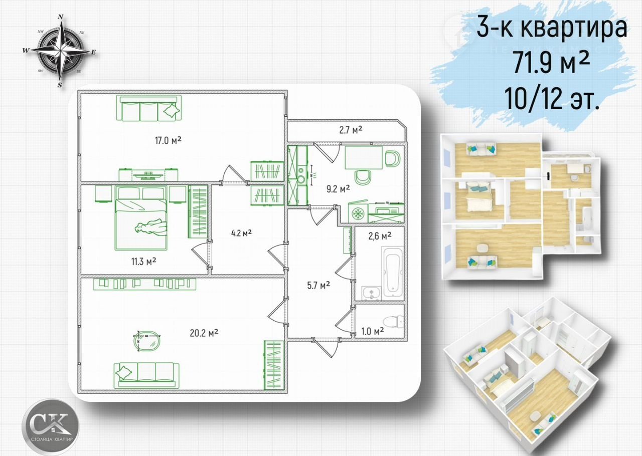 •    Общая площадь:  71,9 м²