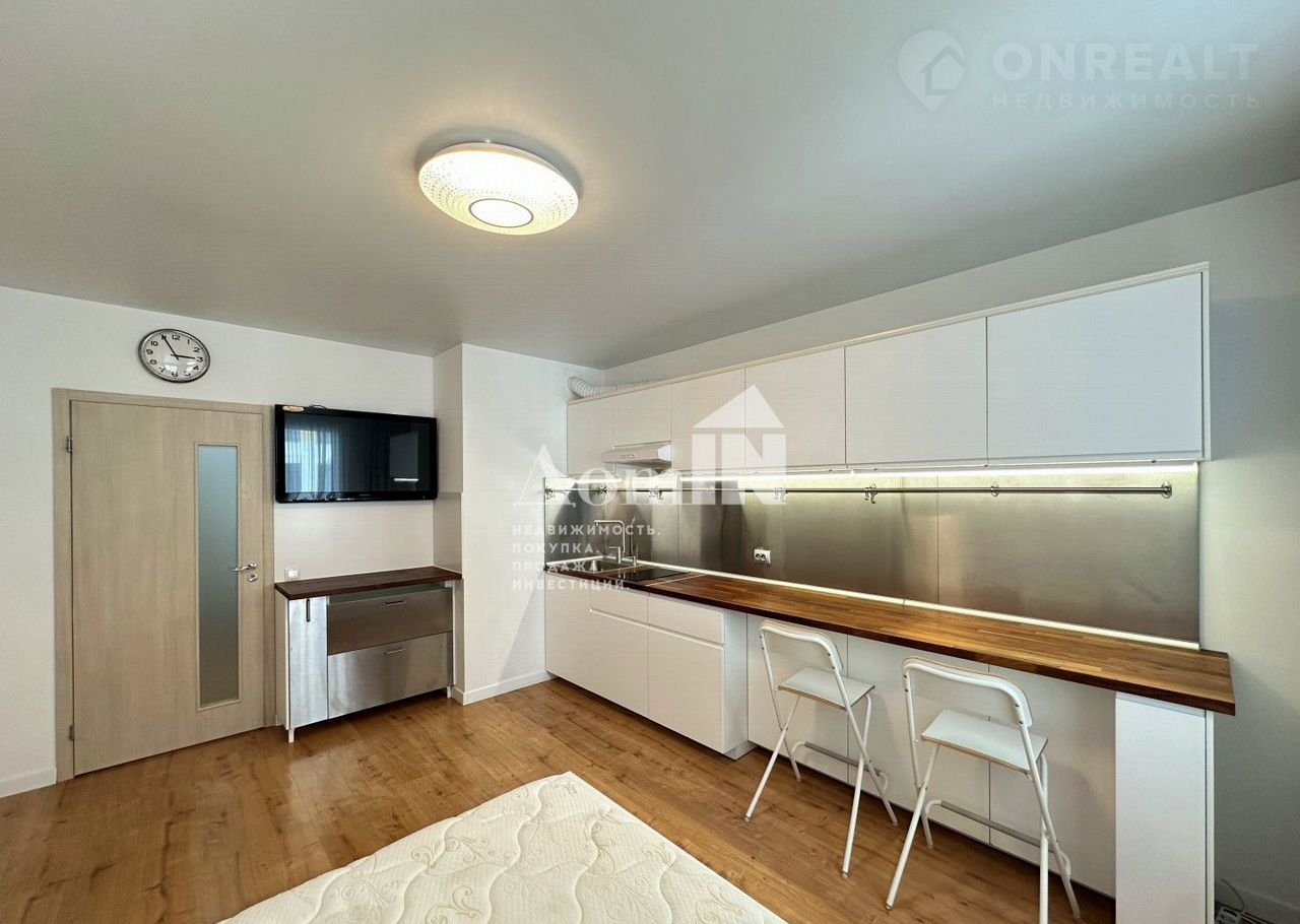 Просторная  светлая студия, смежный санузел, хорошая гардеробная в коридоре.