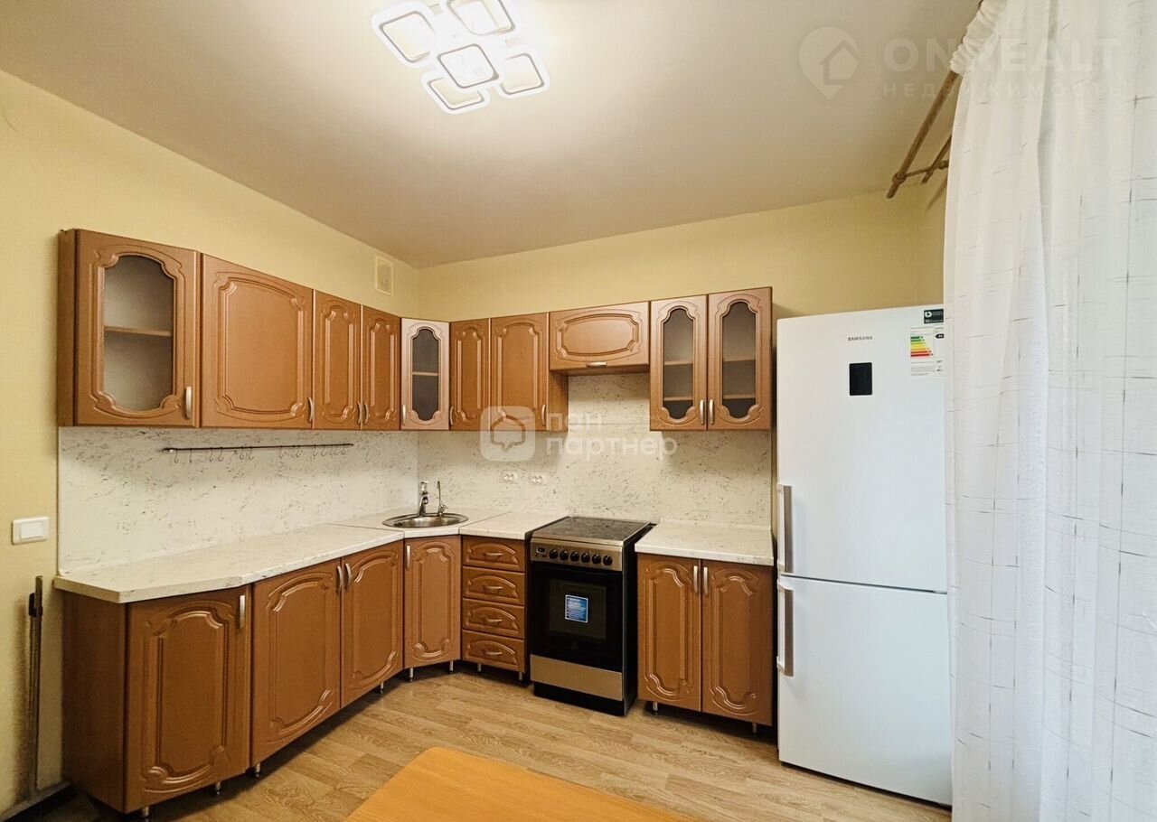 Встроенная кухня, плита, холодильник, мебель в спальне.