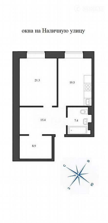 Евроремонт. Окна выходят на Наличную улицу. Планировка - спальня, проходная комната, оборудованная кухня, санузел. Высокие потолки 3 м. Большие окна - много света и воздуха.