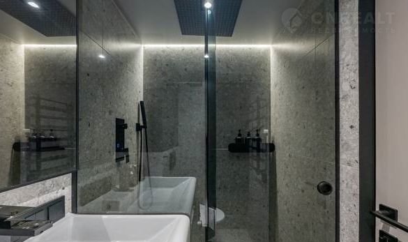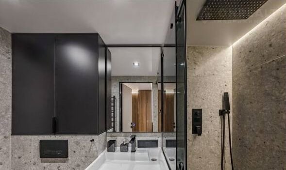 -Совмещенный светлый санузел(просторная душевая зона с тропическим душем,гигдуш и умная крышка унитаза с функцией мойки , подогрева и сушки)
