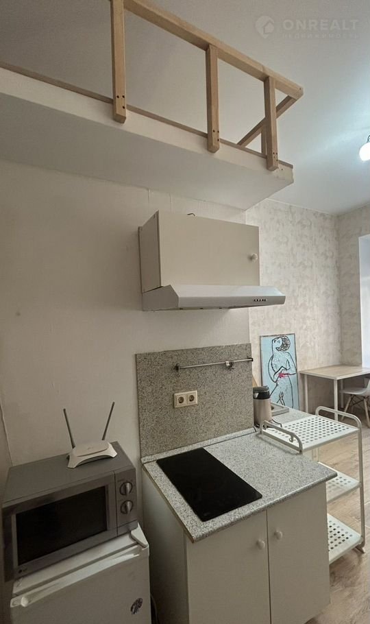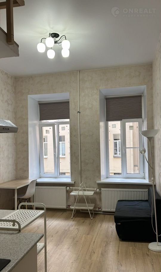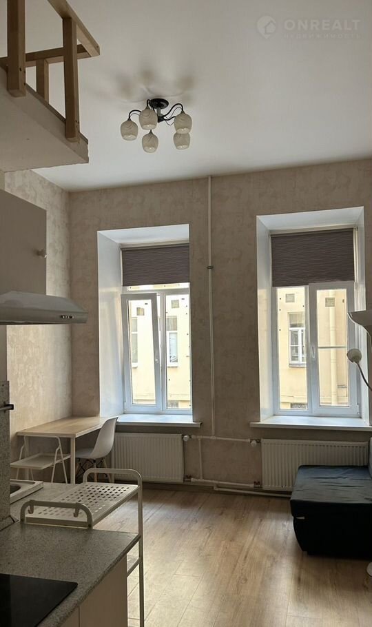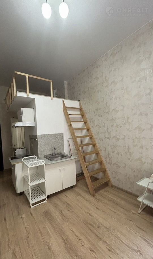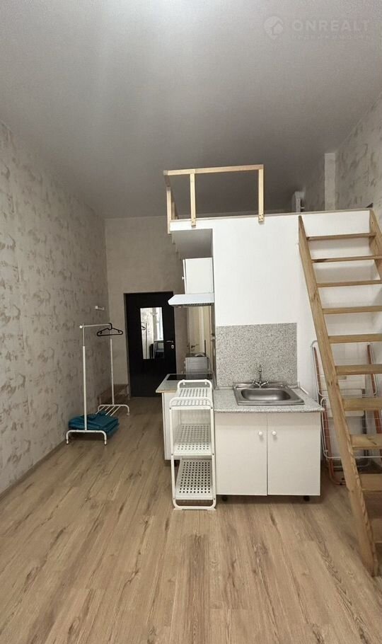 О квартире: площадь студии 19 м2, по документам – это комната. В студии два окна, окна выходят во двор, на северо-восток. Студия оборудована всем необходимым. Высота потолков 3,5 м, оборудован сан.узел. На антресолях – полноценное спальное место.