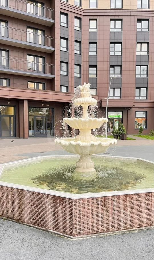 - во двор с детской площадкой, прогулочными дорожками и фонтаном.