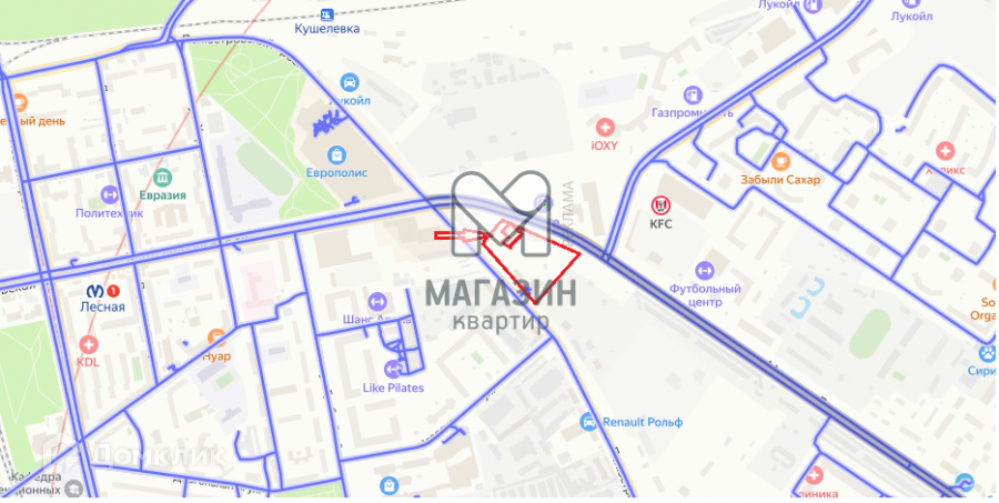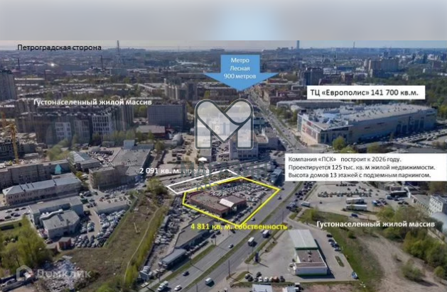 Здание и земельный участок располагаются на стыке Красногвардейского и Калининского районов, в высоком трафике автомобильного и транспортного потоков. Среднее количество машин в день-70000. Рядом 4 остановки, 8 маршрутов, напротив бензозаправка, замена масла, густонаселенный жилой массив. В 2х минутах хотьбы от ТК Петрополис, в 7 минутах- станция метро Лесная. Два въезда: с Кантемировской и Полюстровского проспектов.