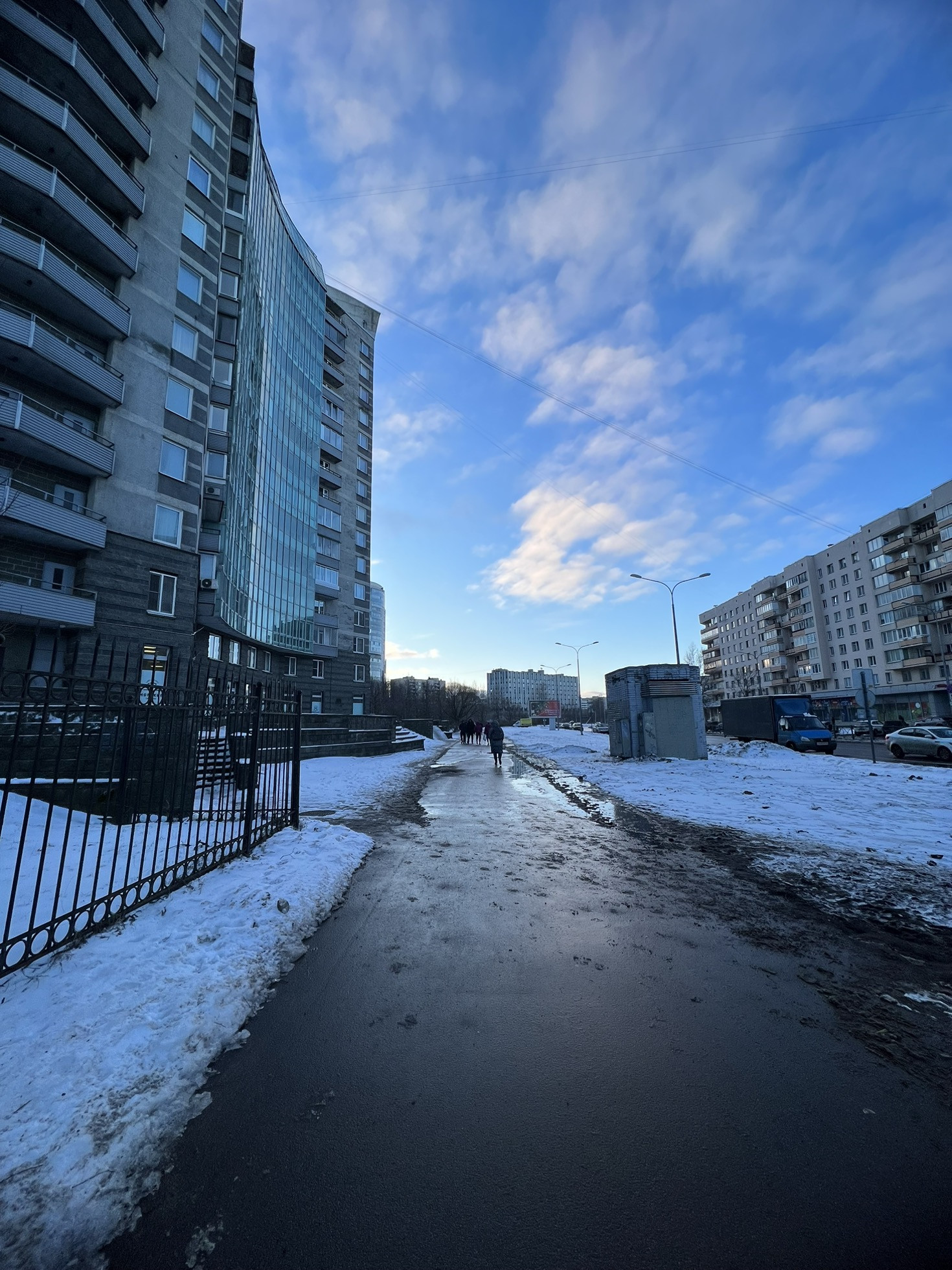 Рядом оживленный густонаселенный элитный микрорайон с высотками.