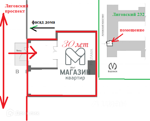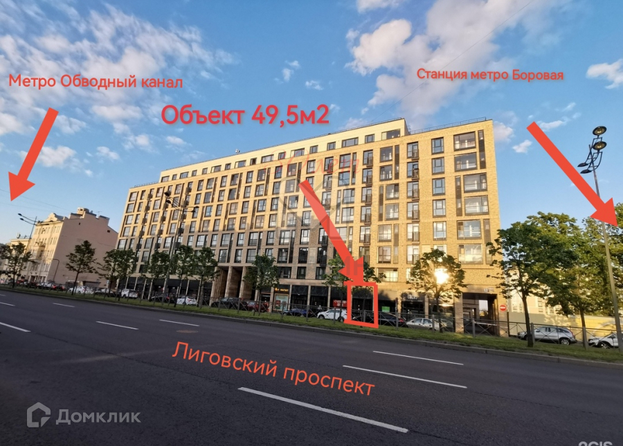 Помещение расположено на первой линии Лиговского проспекта в непосредственной близости от строящейся станции метро Боровая и в 20 метрах от остановки общественного транспорта.