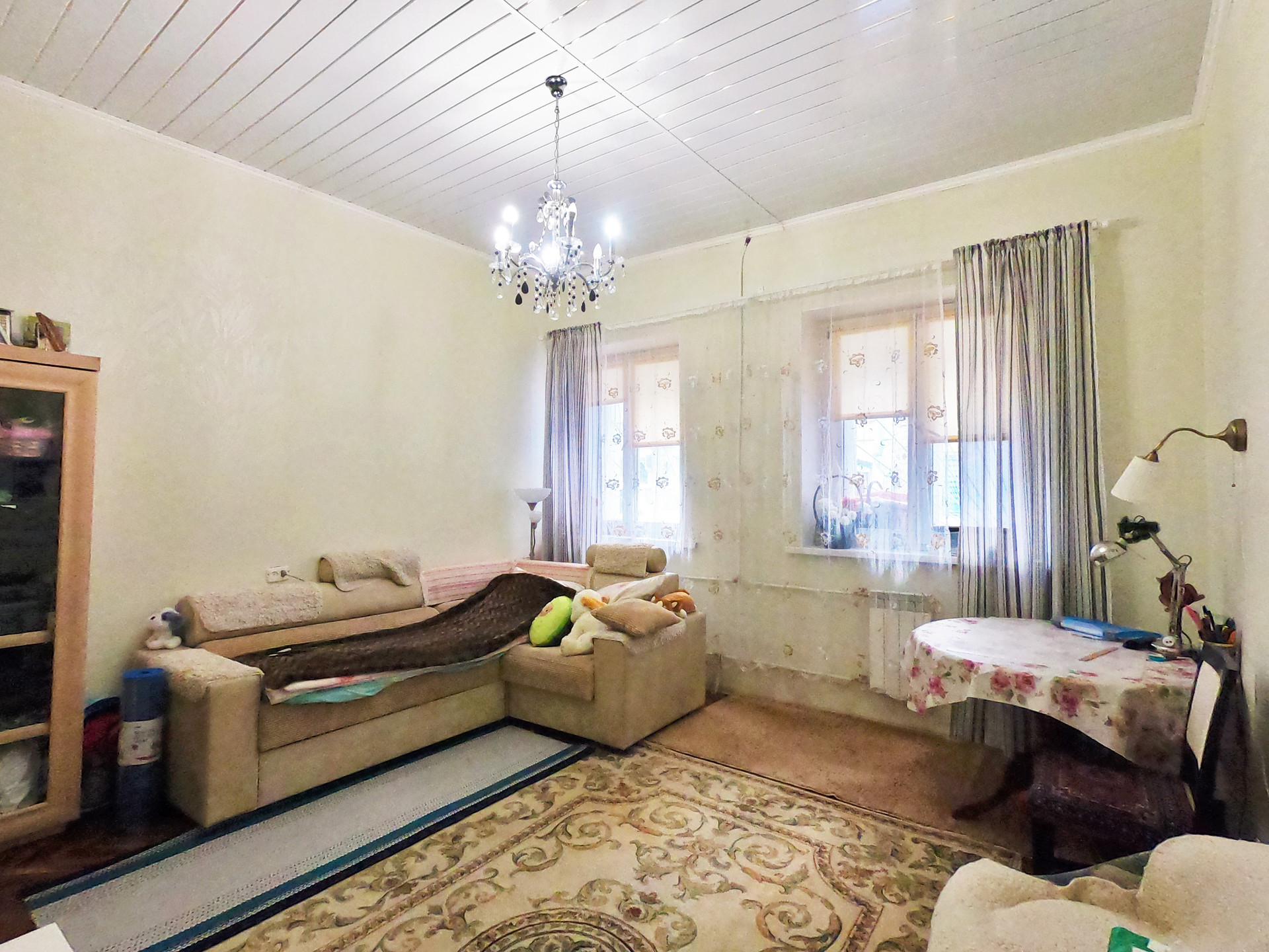 В комнатах по два окна, которые выходят в тихий двор прямо на зелёный газон с берёзкой