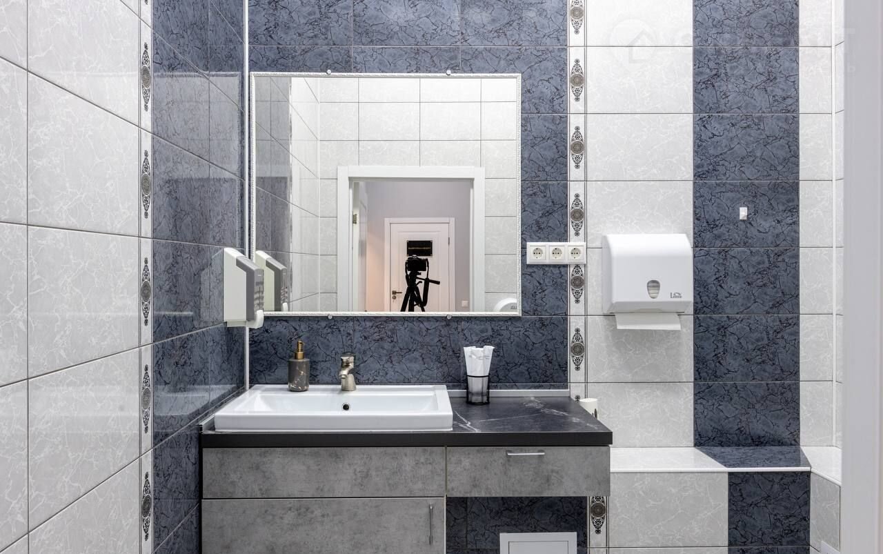 Отделка выполнена в актуальном дизайне, в деликатных серо-бежевых оттенках. Полы в холле и вспомогательных помещениях покрыты керамическим гранитом под натуральный каррарский мрамор с противоскользящим покрытием. Стены кабинетов облицованы керамической плиткой. Стены в холле оформлены штукатуркой и от пола до потолка декорированы кафелем сочного желтого цвета. Это придает пространству динамичности и свежести.  Санузел облицован кафелем, имитирующим природный камень темно-серого и молочного оттенка. Столешница под раковину украшена керамогранитом в цвет стен.