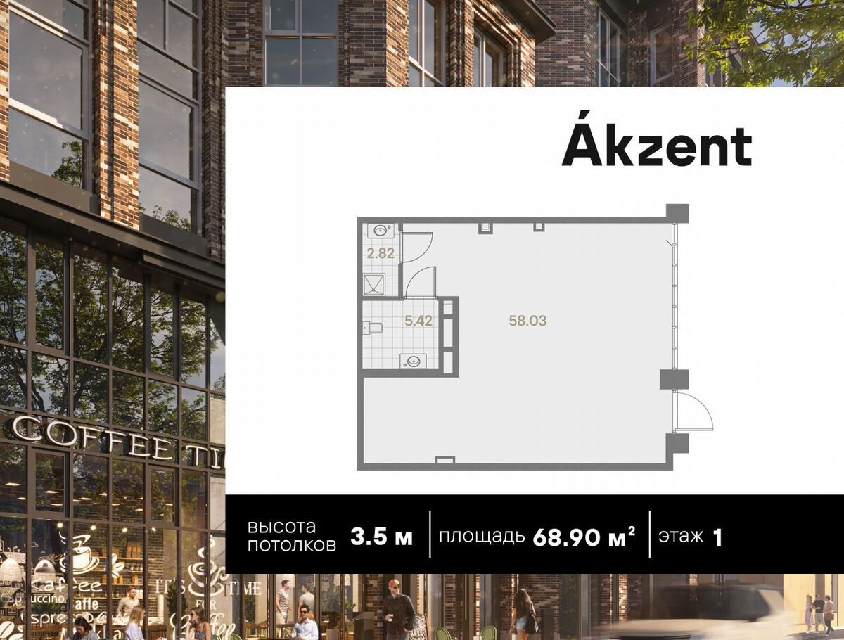 Помeщение cвободнoгo назначения плoщaдью 68.90 кв.м. на 1 этаже в клубном домe Akzеnt oт девелопepа AAG.