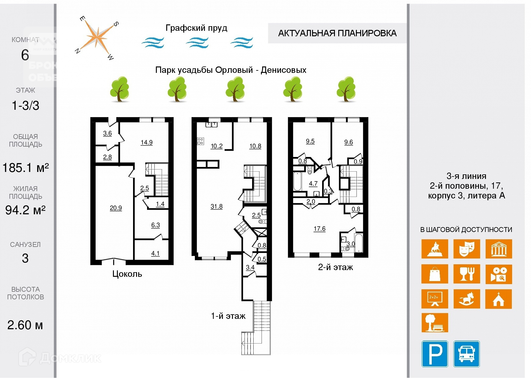 3-этажный таунхаус, 185.1 м2, на продажу в Санкт-Петербурге, 3-я линия 2-й половины, 17к3