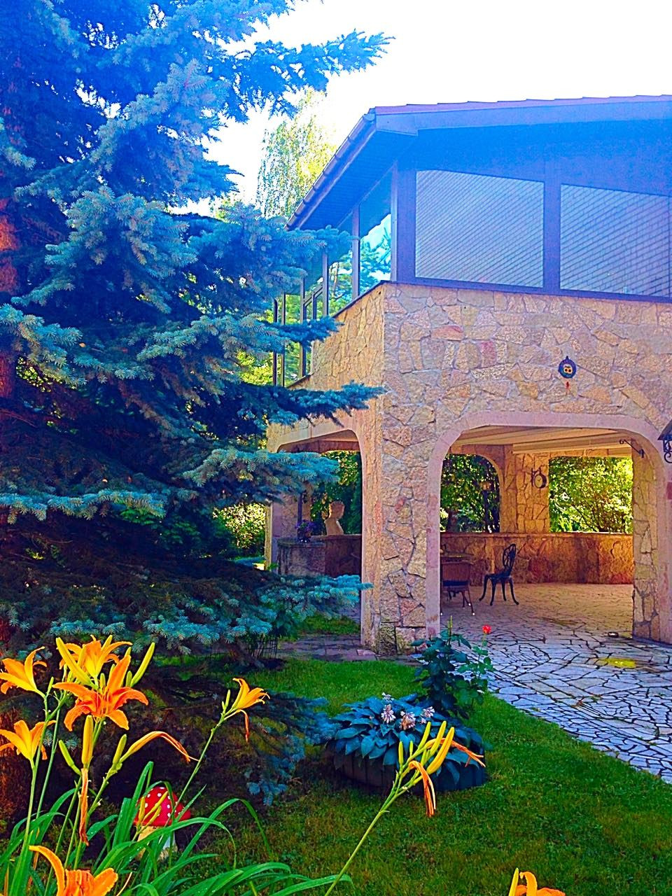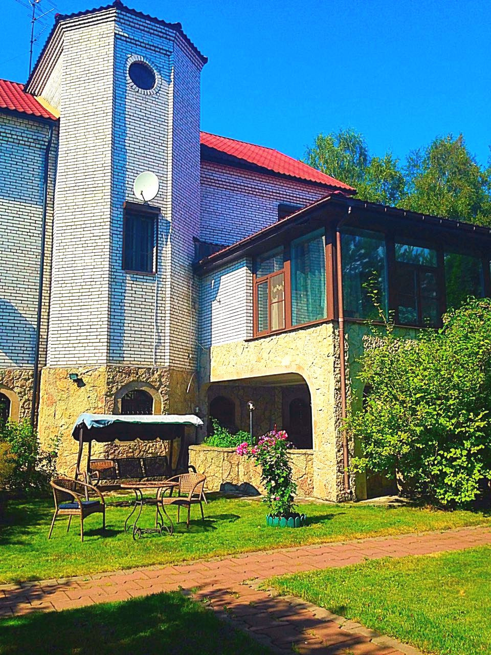 На участке 17 соток выполнен ландшафтный дизайн. Есть фруктово-ягодный сад, зона барбекю, беседки, парник. Имеется садовая мебель, скамейки и лежаки. Дом и окрестности очень красивы и в зимнее время. На территории нередко можно увидеть белок!