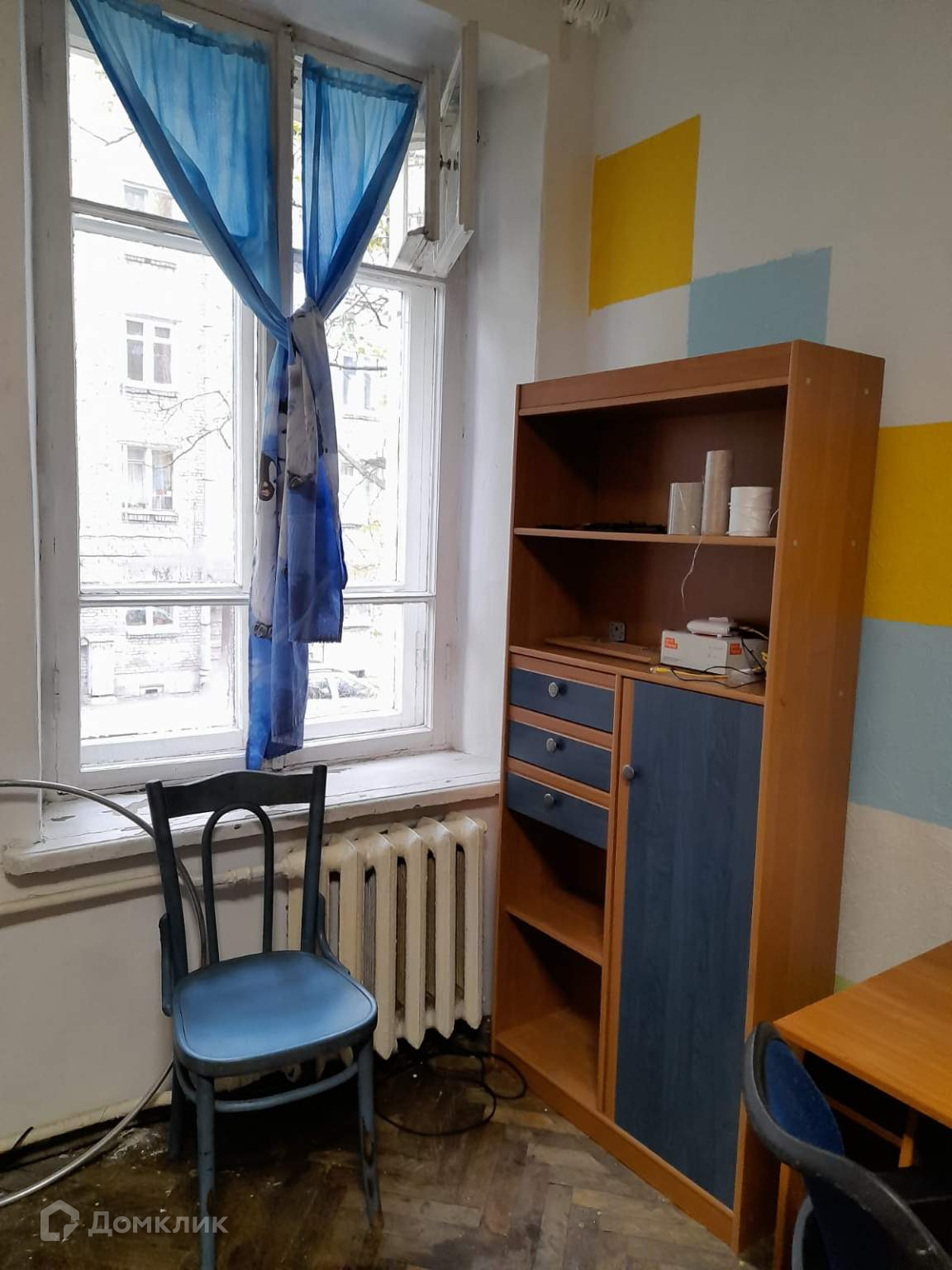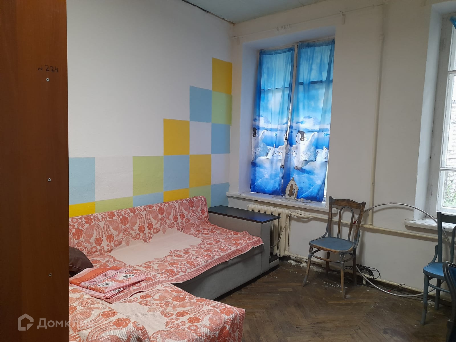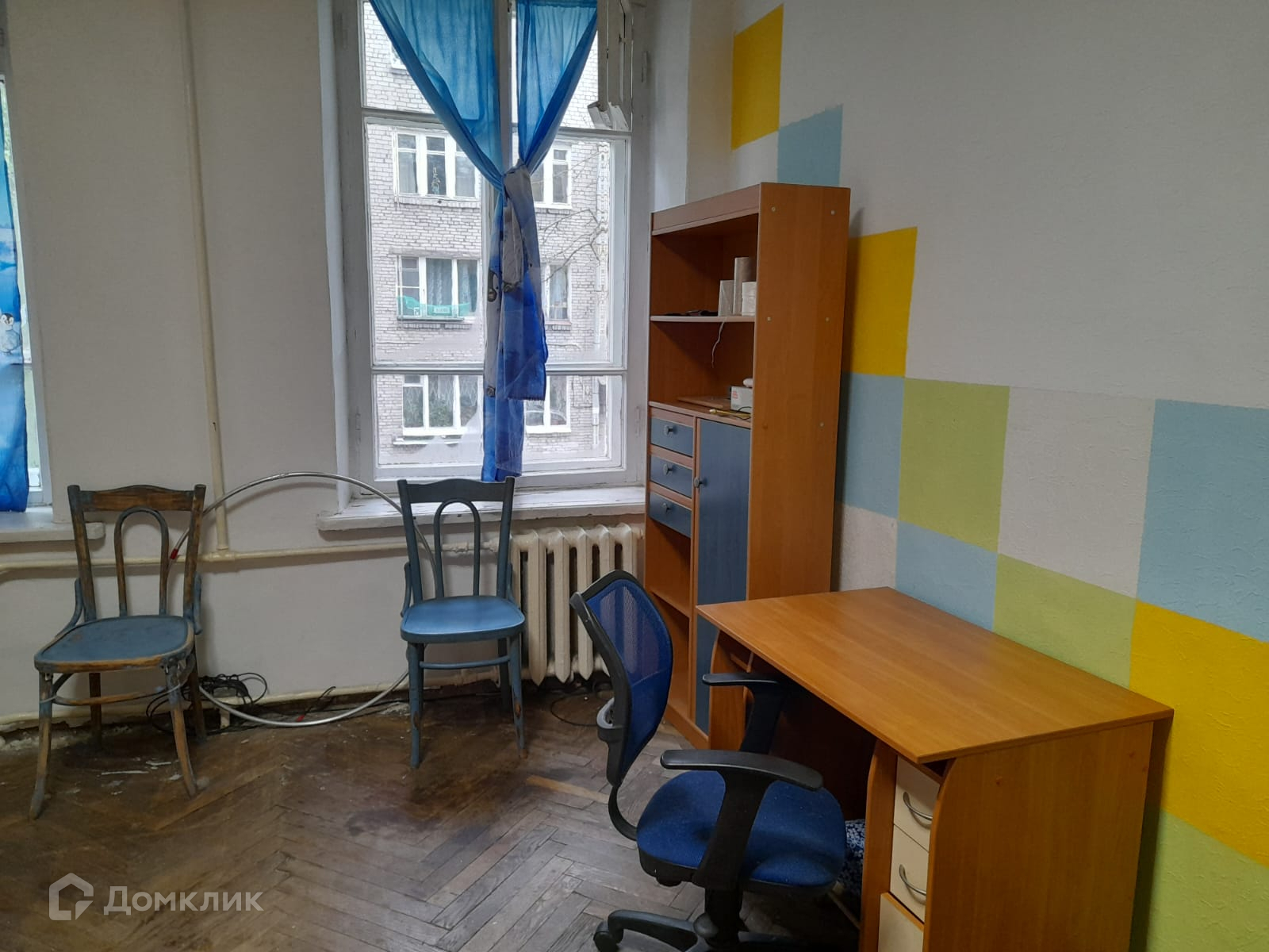 На полу паркет, входная дверь обычная, балконов - нет, лоджий - нет, окна выходят во двор.