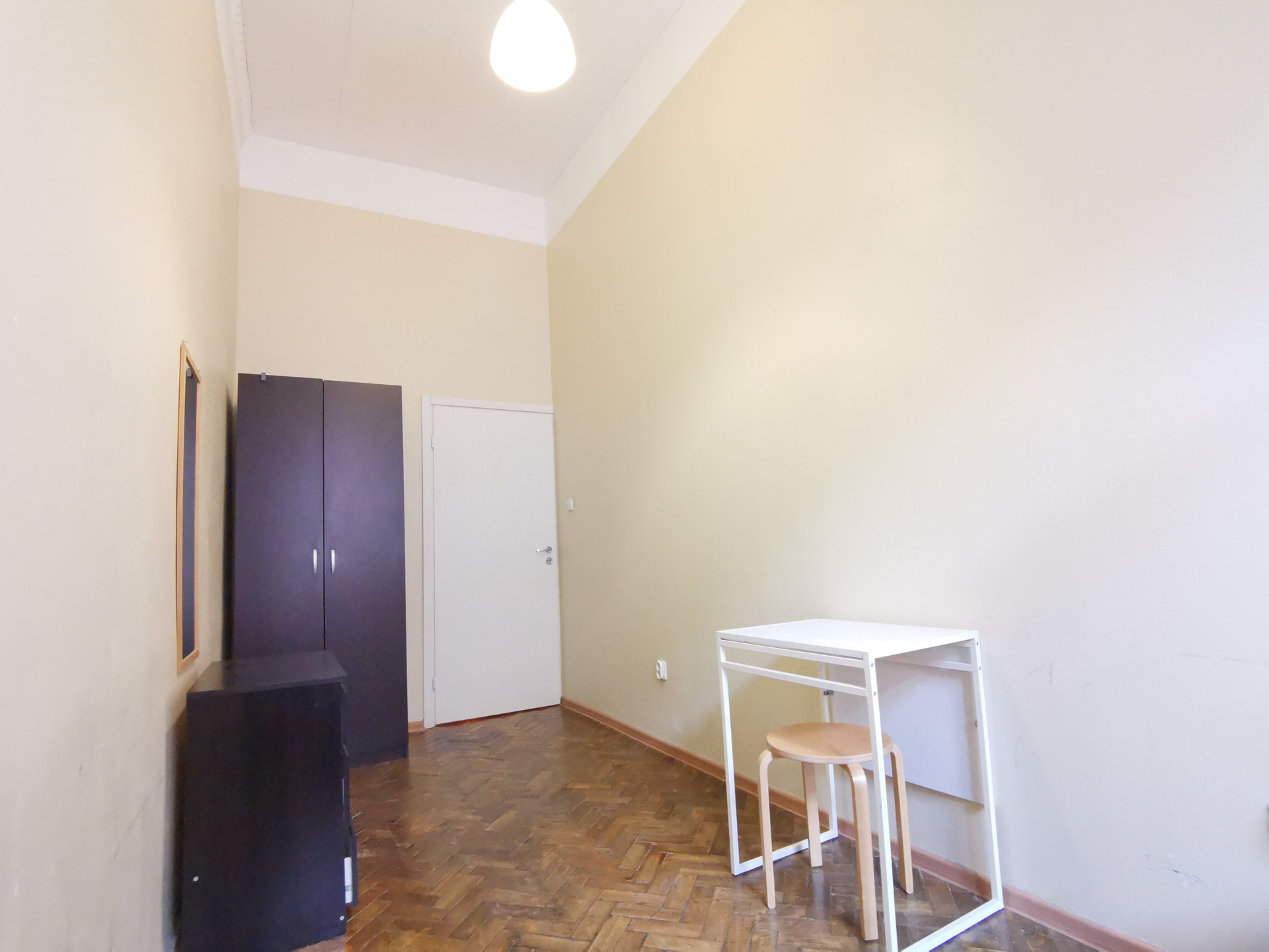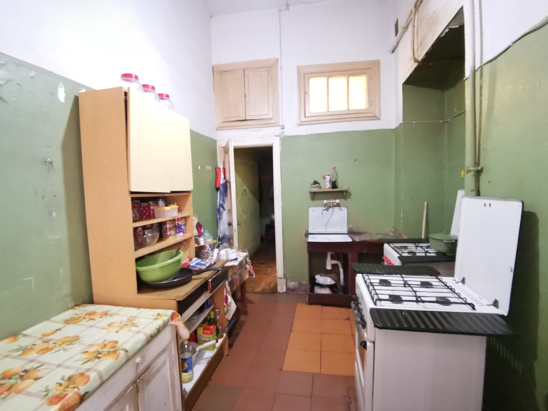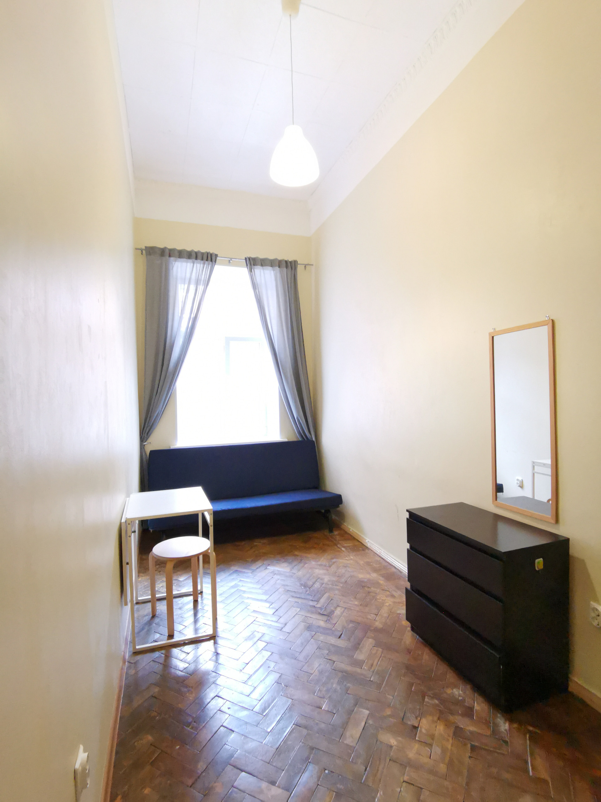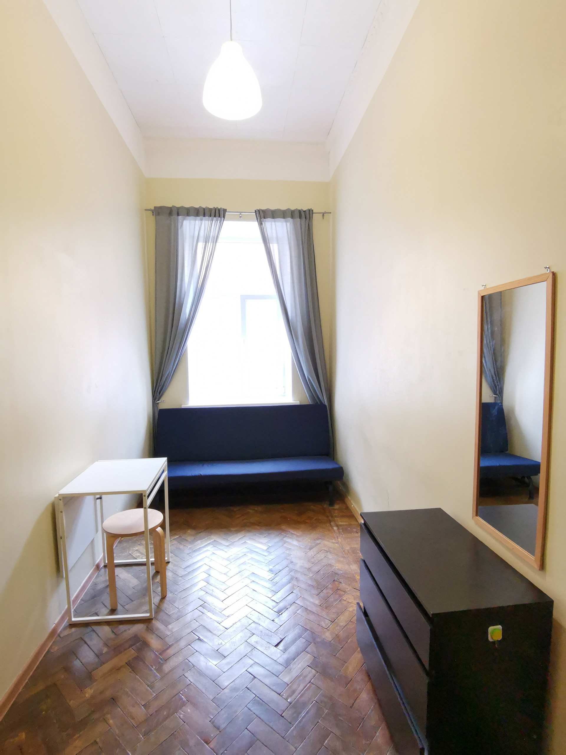 Комната изолированная. Хорошее состояние, высокие потолки 3.8м,  мебель (диван, шкаф, комод, стол+2 стула). Стиральная машина на кухне. К комнате прилагается отдельная кухня-прихожая 8м². (на 3 комнаты) в которой находятся холодильник, микроволновка, чайник, стол+стулья. Есть и общая кухня 18м². С/У раздельный, Установлены стеклопакеты. Проживание строго без детей и животных.