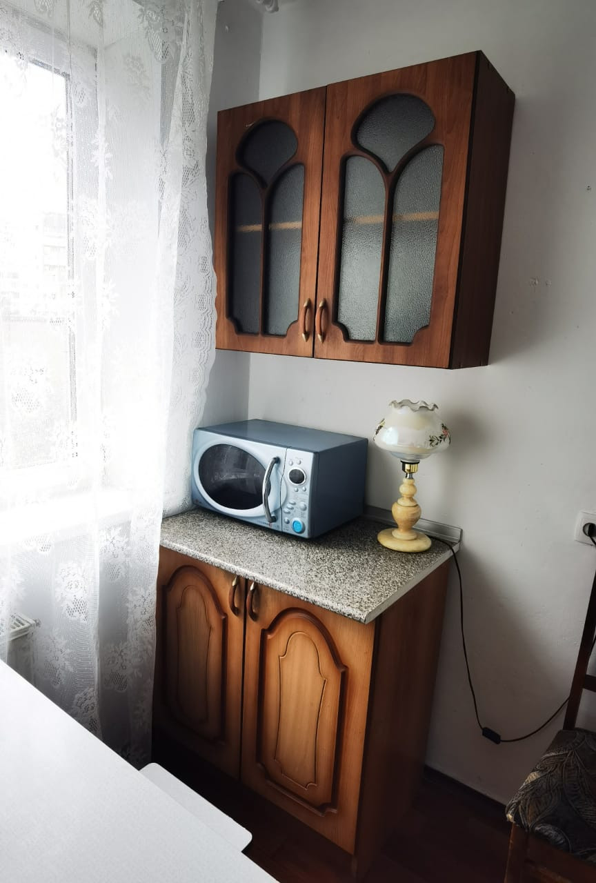 Комната укомплектована всем необходимым: раскладной двухспальный диван, шкаф для хранения вещей, столик, холодильник, телевизор,  микроволновка.