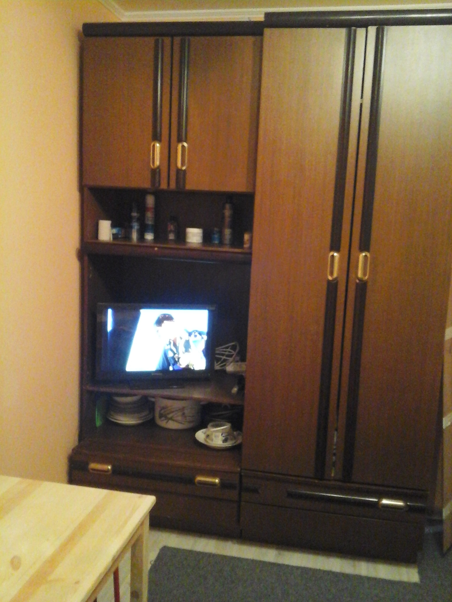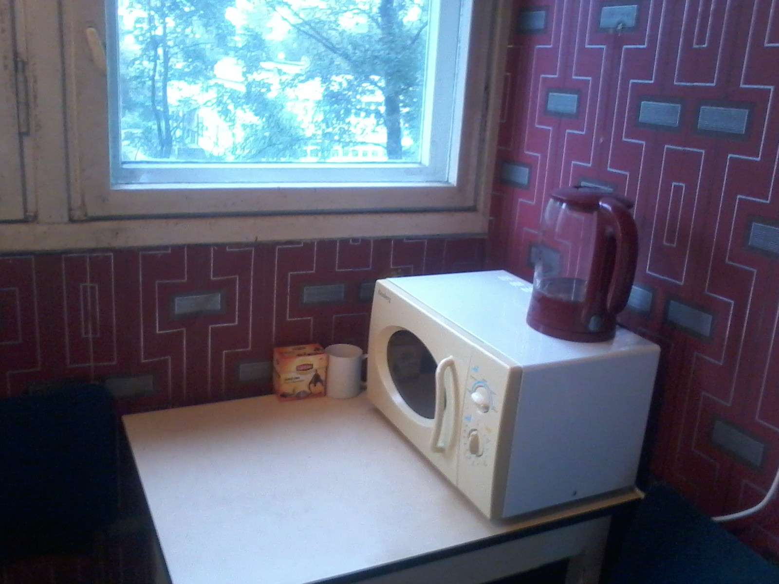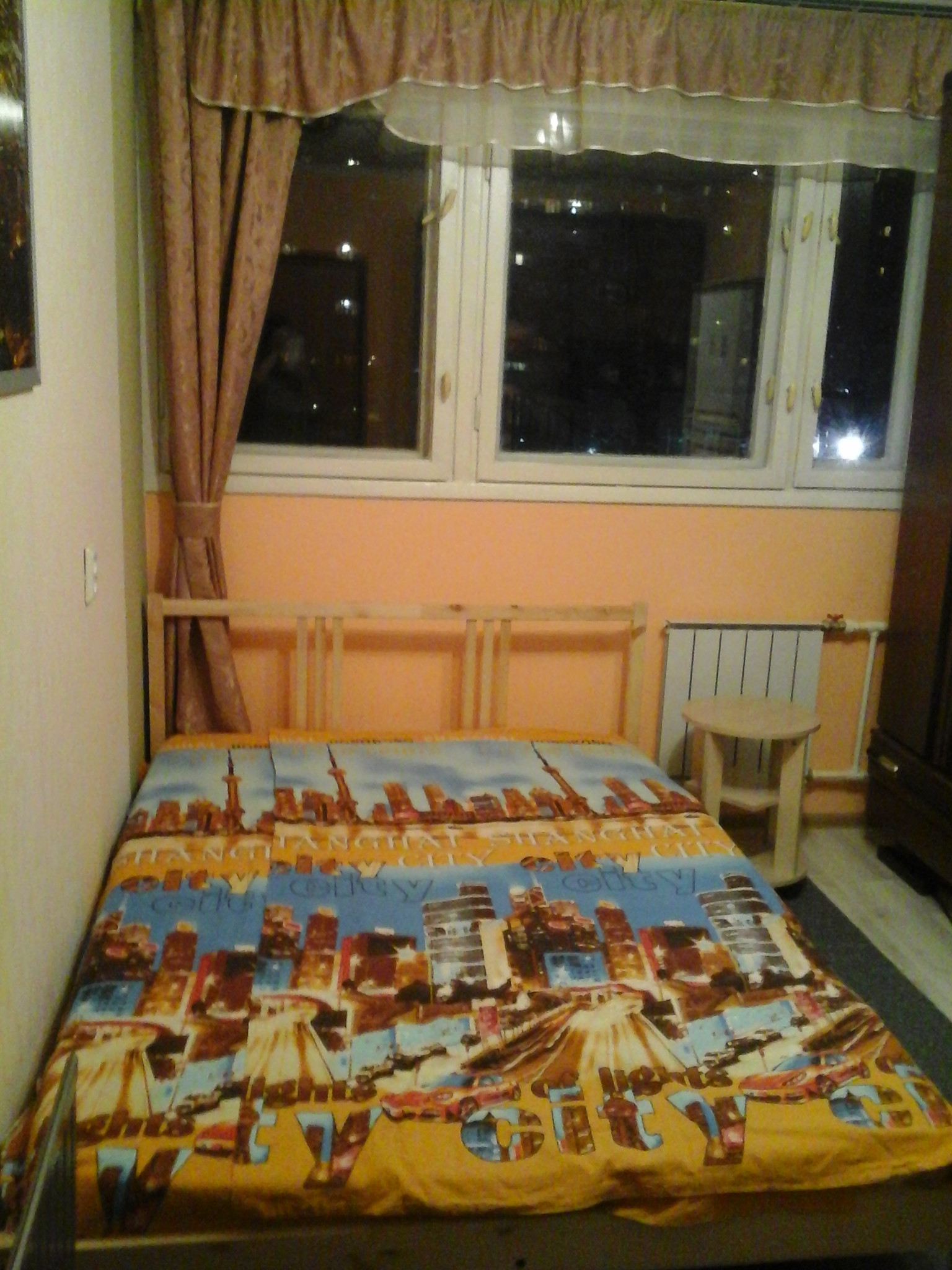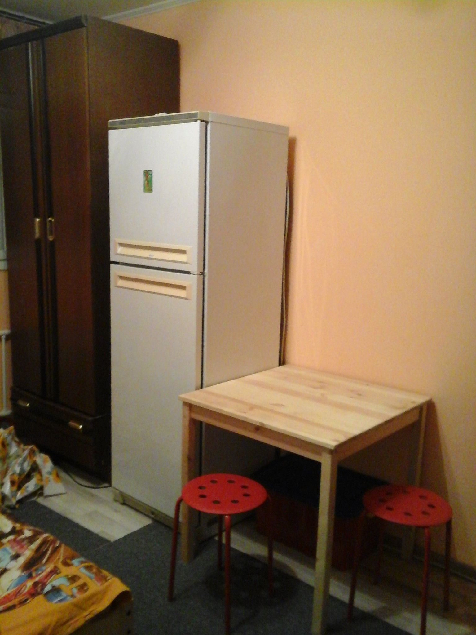 Окна в тихий, зеленый двор. Есть кровать. Стол, тумбочка и шкаф.