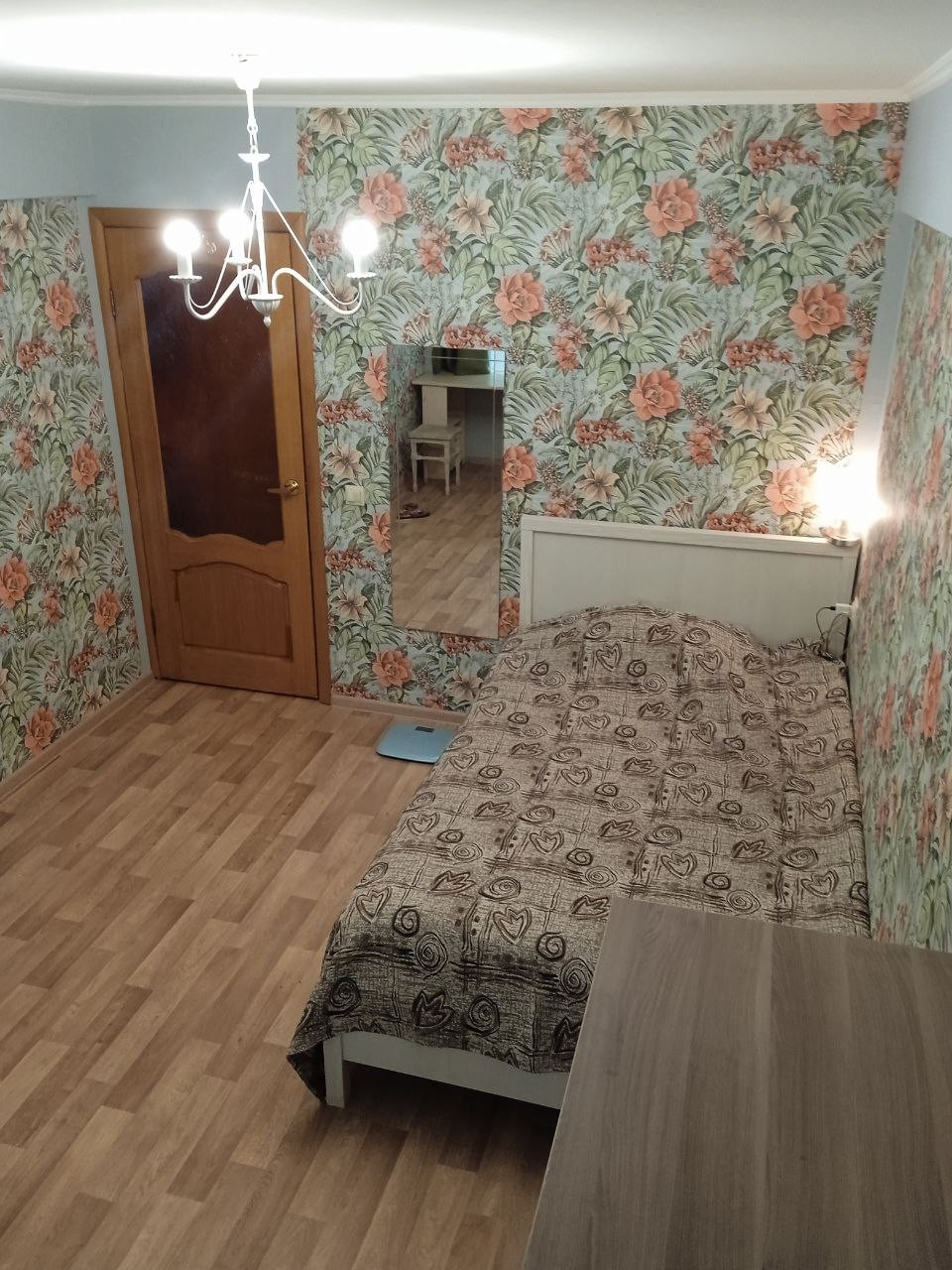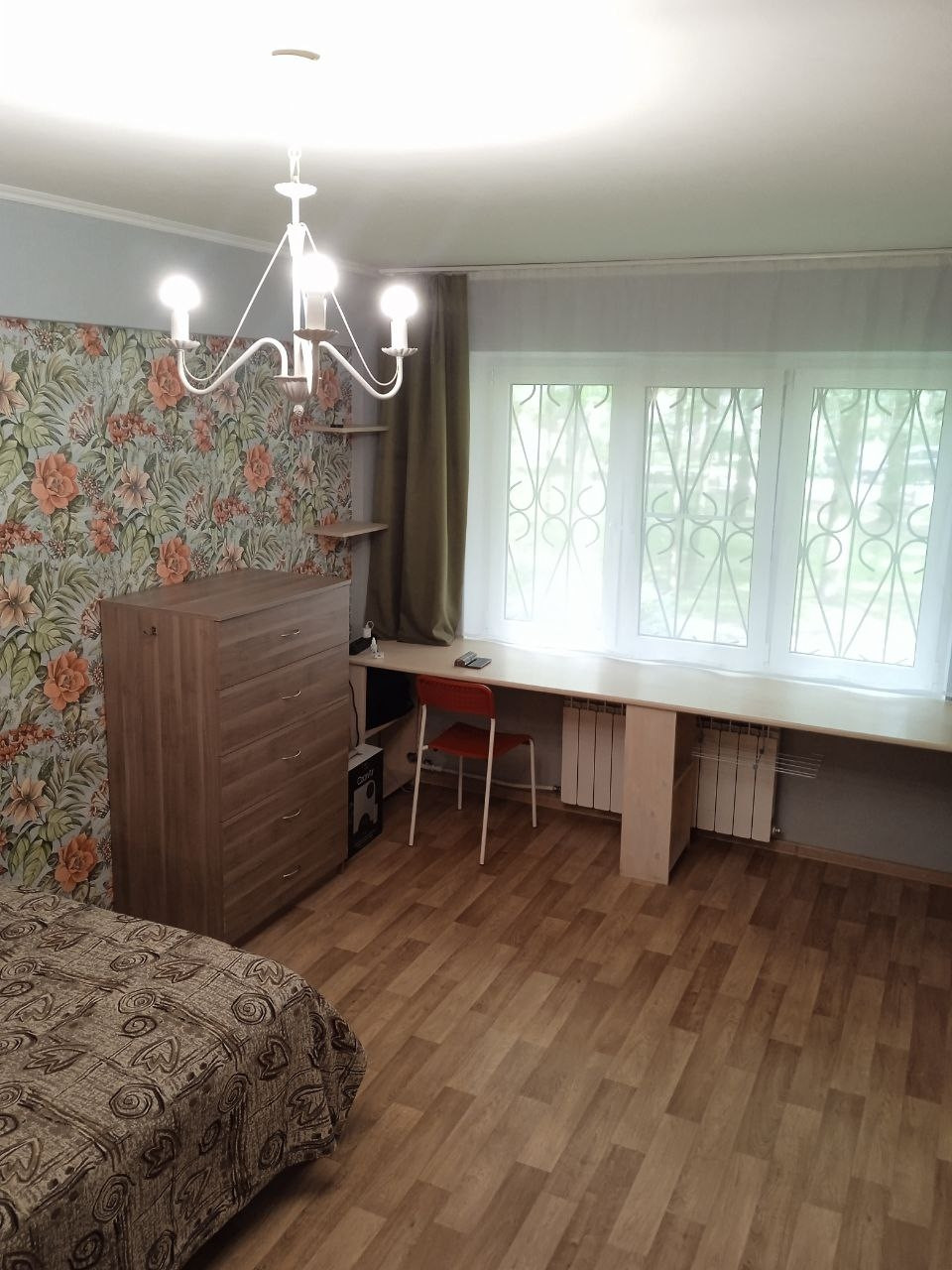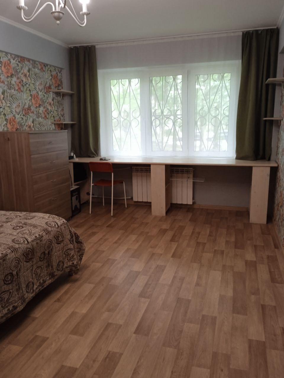 В квартире есть все необходимое (интернет, стиральная машина, микроволновая печь). В комнате есть длинный стол для обучения или работы, односпальная кровать с ортопедическим матрасом, комод для одежды.