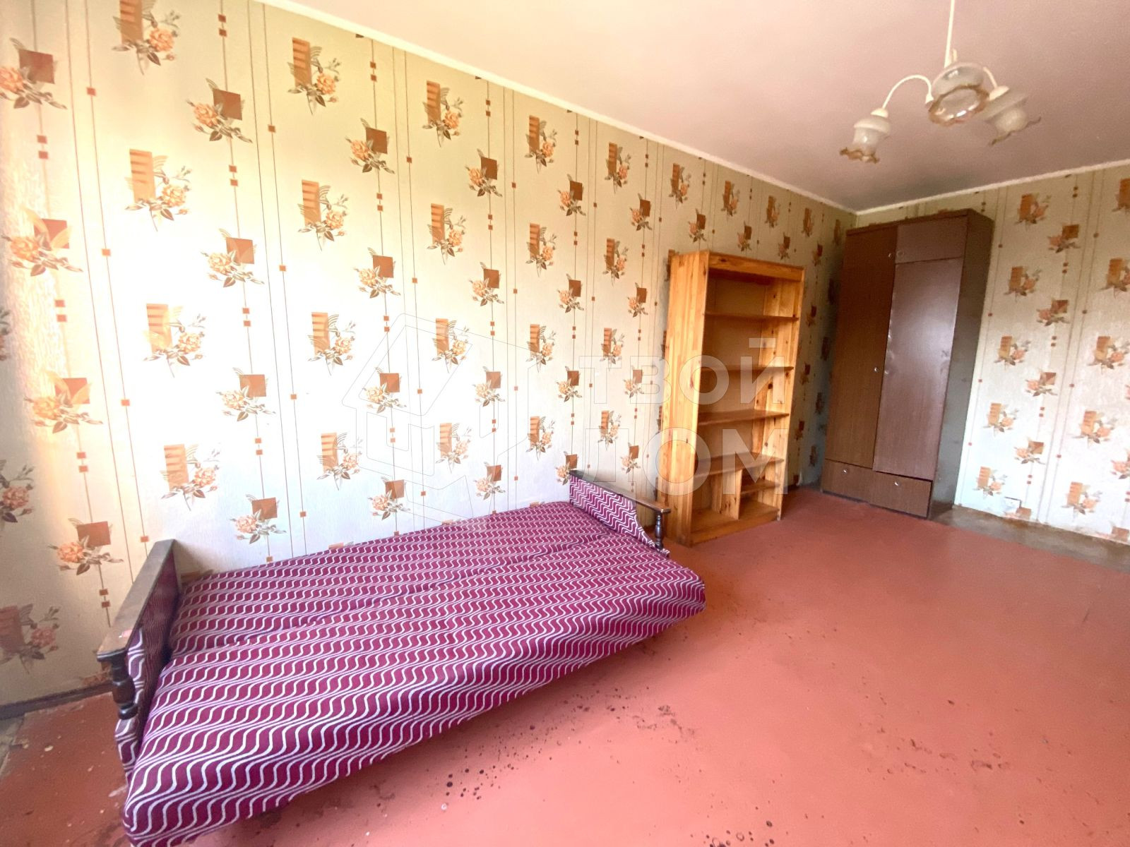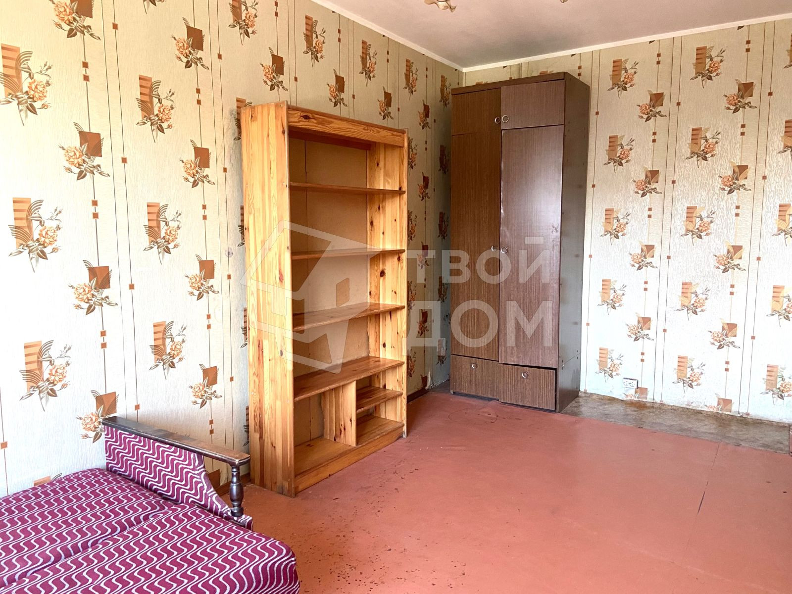 В комнате есть раскладной диван, шкаф, стол, стулья. Кухня отдельно, так как это бывшее общежитие. Плита есть.