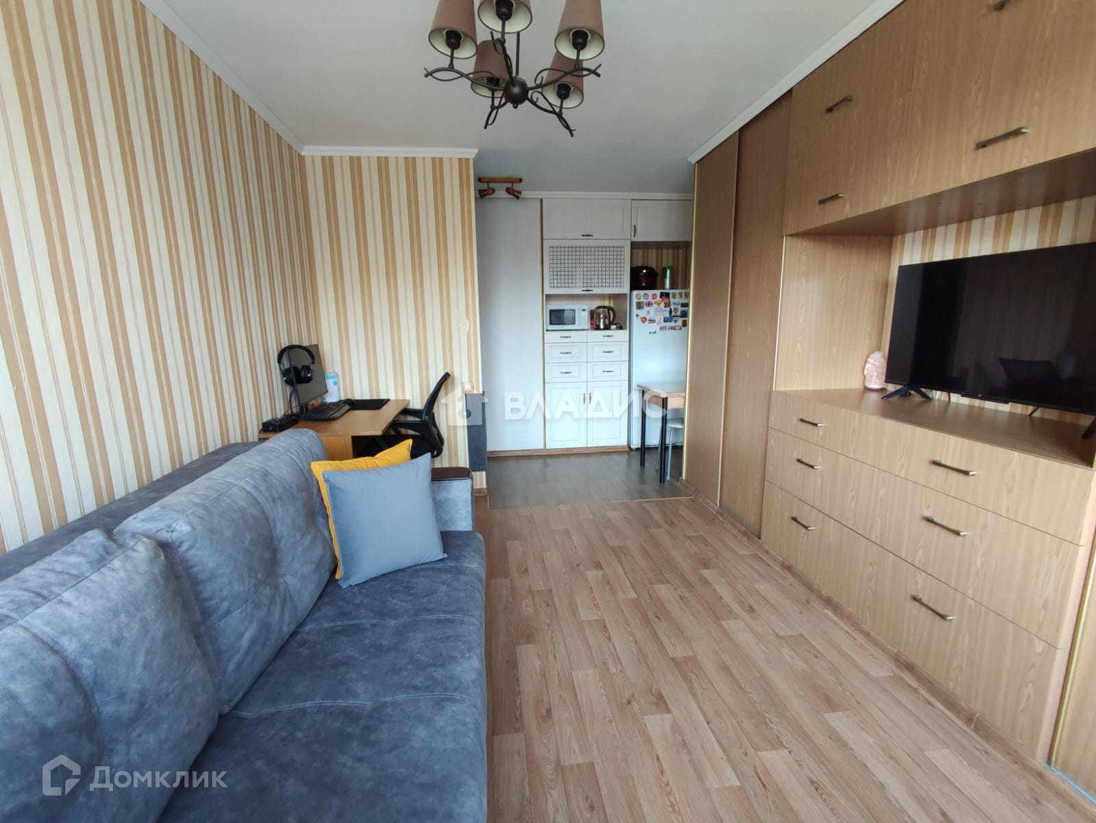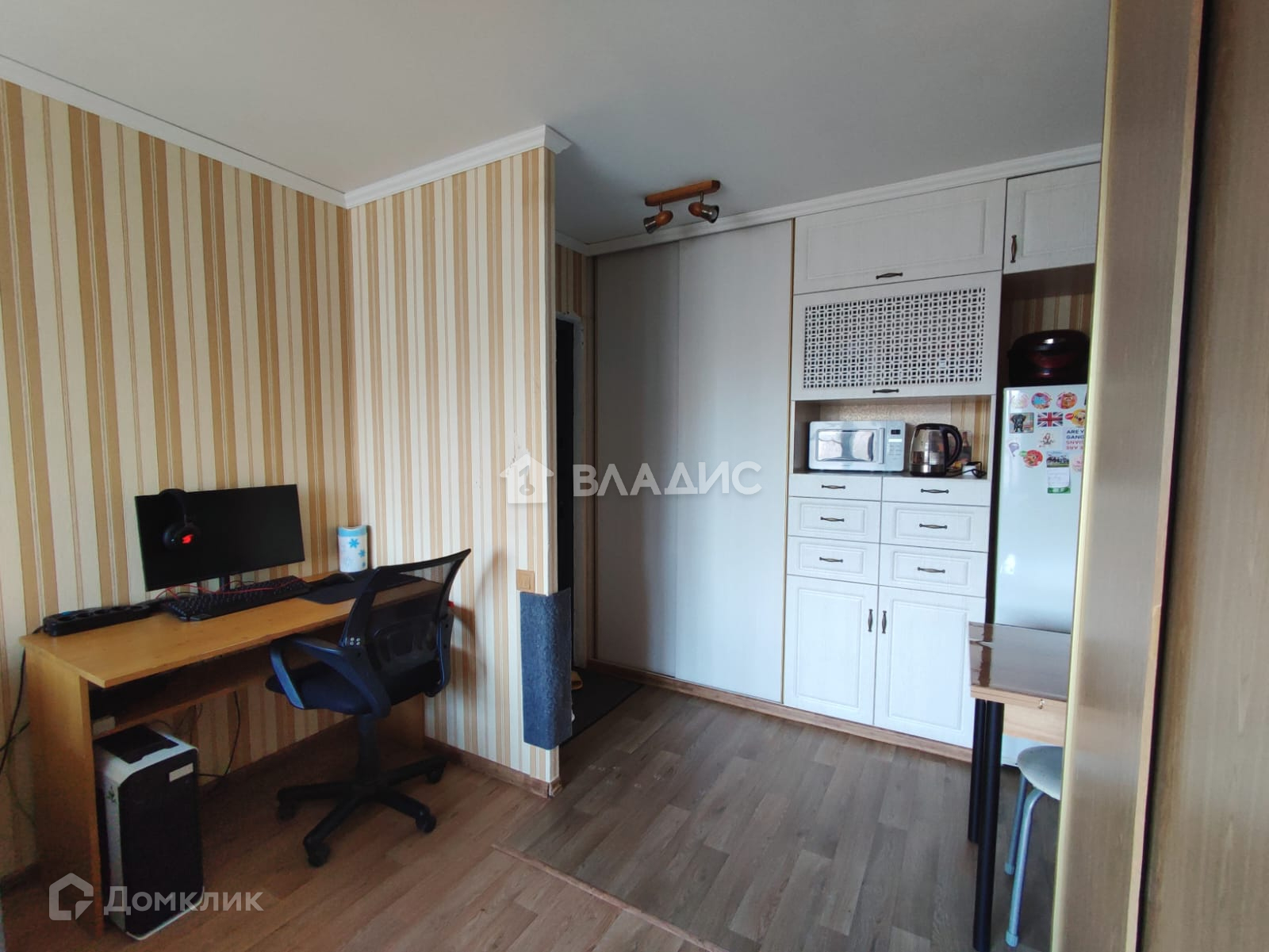 Есть спальное место, стол для занятий, стенка, холодильник, микроволновка. В квартире чисто и тихо. Все соседи хорошие и дружные.
