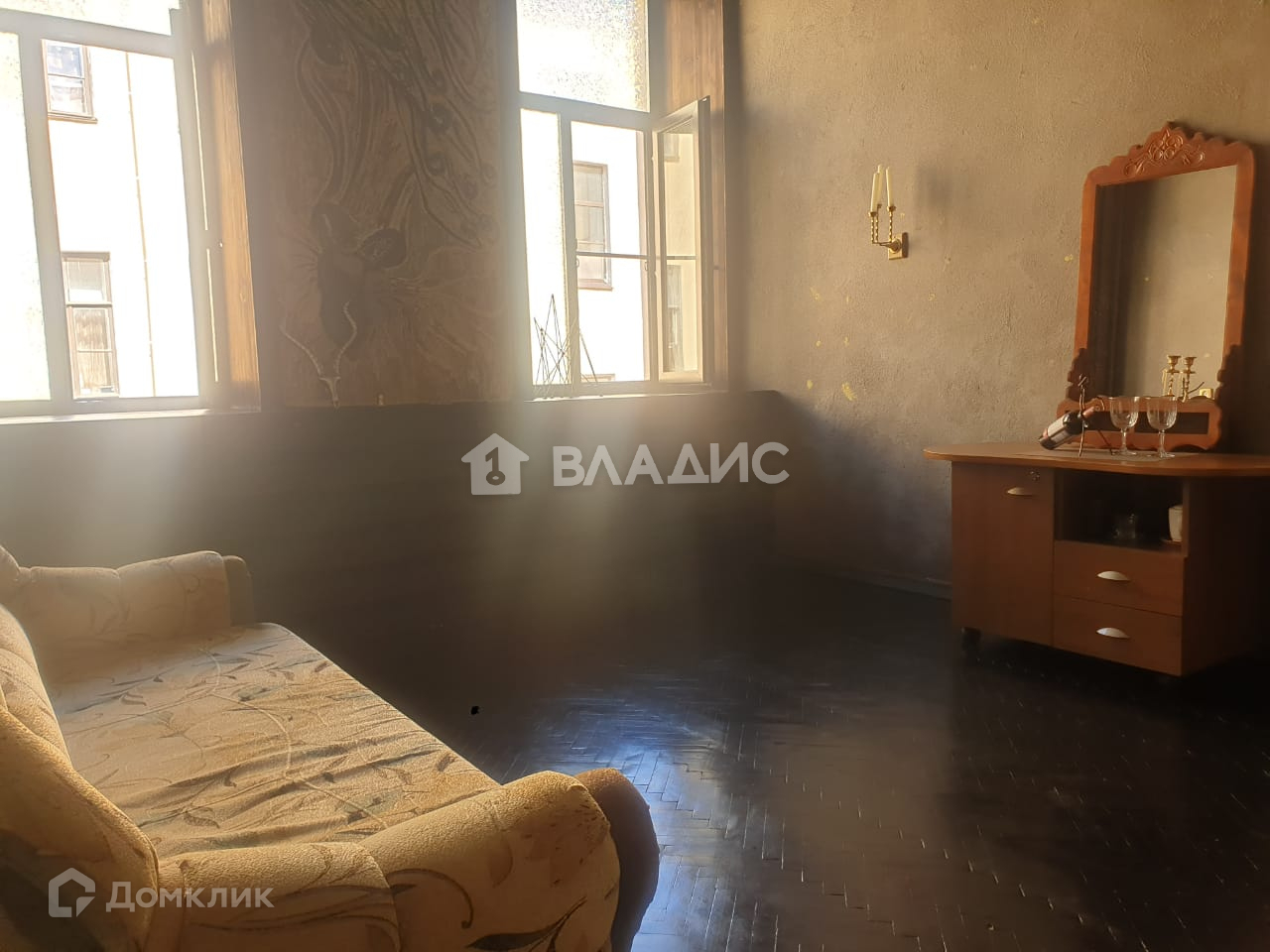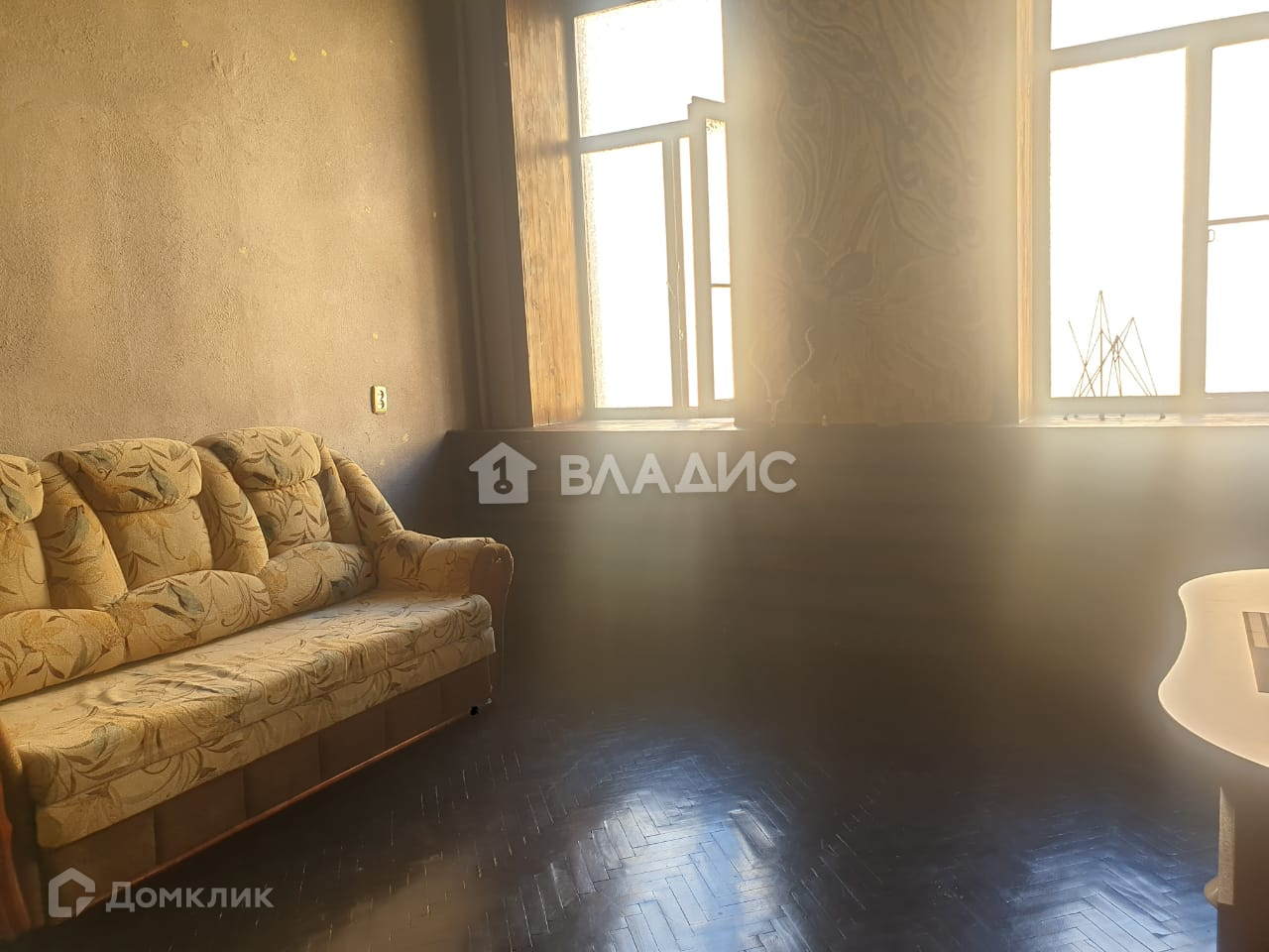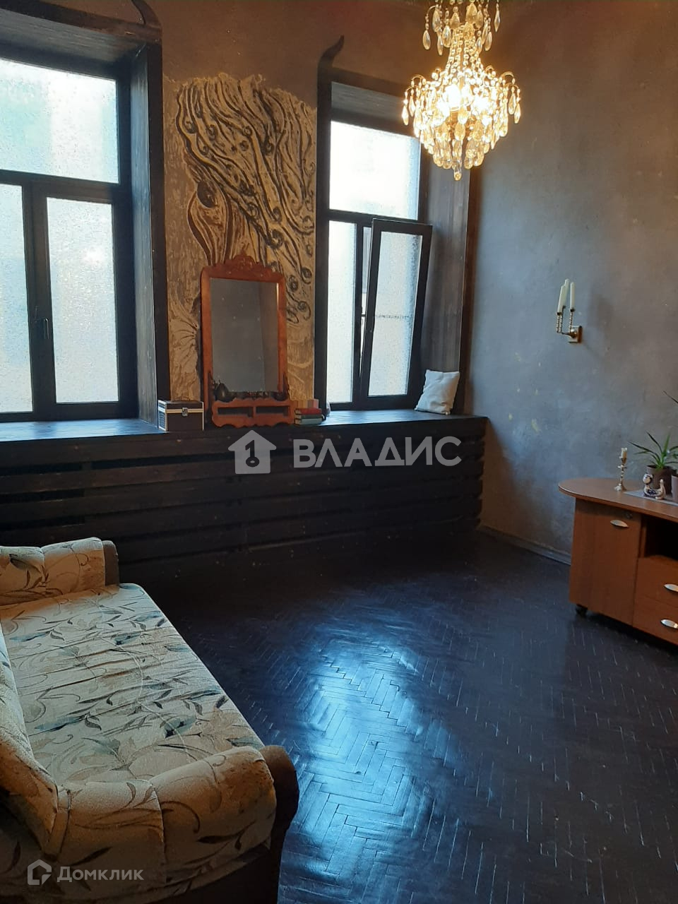 В комнате есть удобный раскладной диван, что позволит полноценно разместить двух человек, выполнен хороший ремонт, сохранились лепнина на потолке и дубовый паркет, а глубокие подоконники из натурального дерева станут отличным местом для отдыха .
