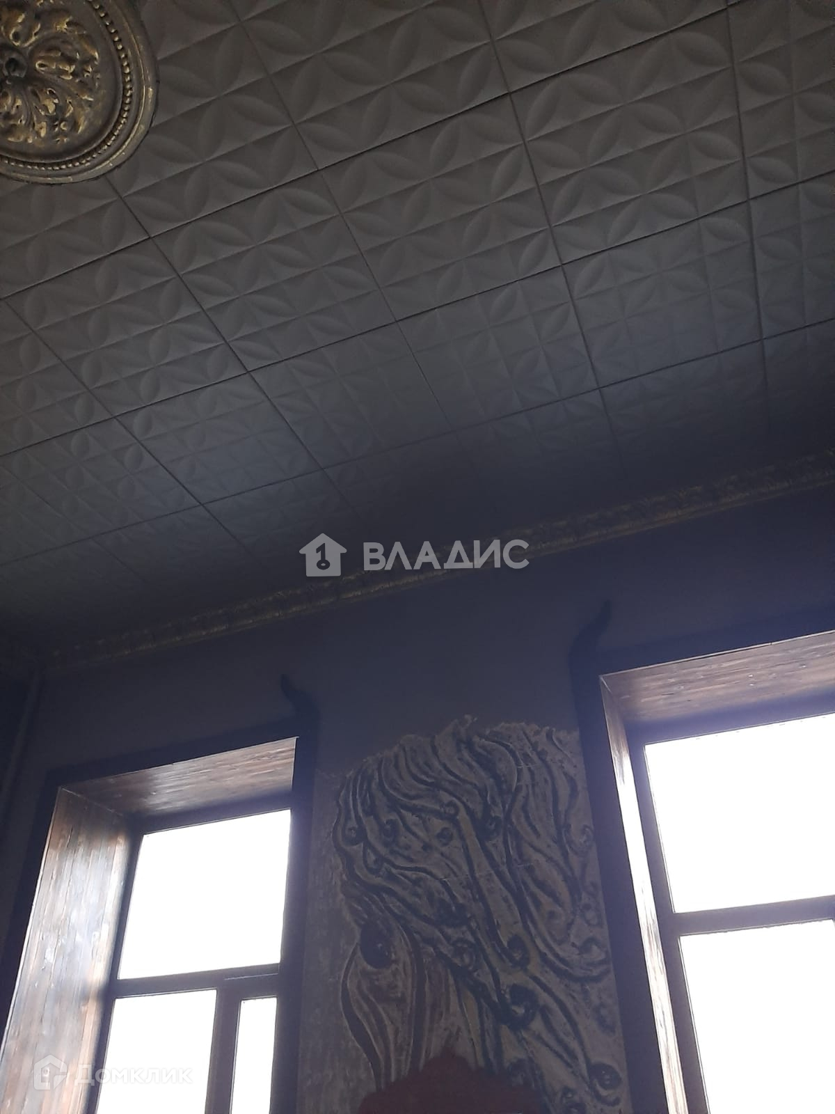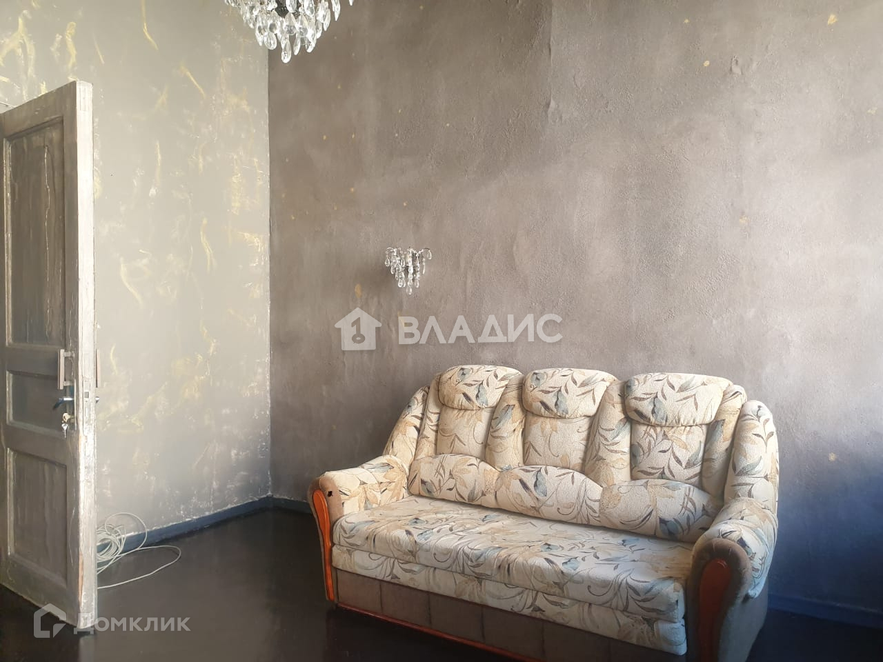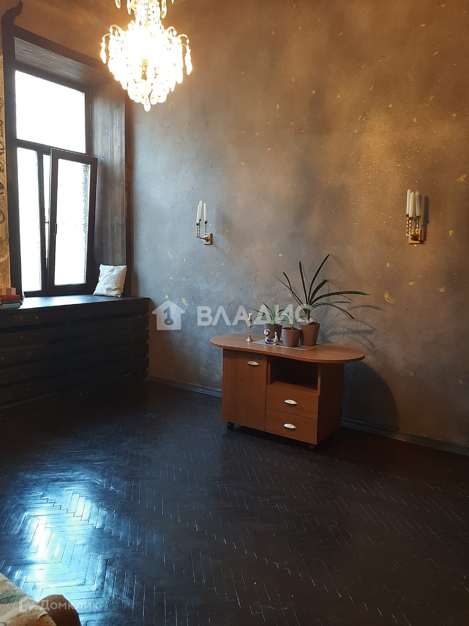 В комнате есть удобный раскладной диван, что позволит полноценно разместить двух человек, выполнен хороший ремонт, сохранились лепнина на потолке и дубовый паркет, а глубокие подоконники из натурального дерева станут отличным местом для отдыха .