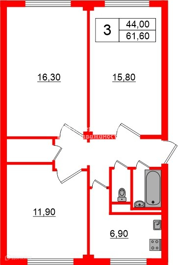 Общая площадь 61.6 м2