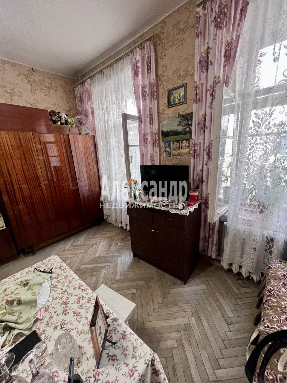 В комнате имеется все необходимое для проживания. В ней имеются кровать, раскладной диван-книжка, шкаф, стол, стулья. Холодильника и стиральной машины - нет. Комната теплая, в ней расположены две батареи отопления. Окна деревянные в хорошем состоянии. На полу - паркет в хорошем состоянии.