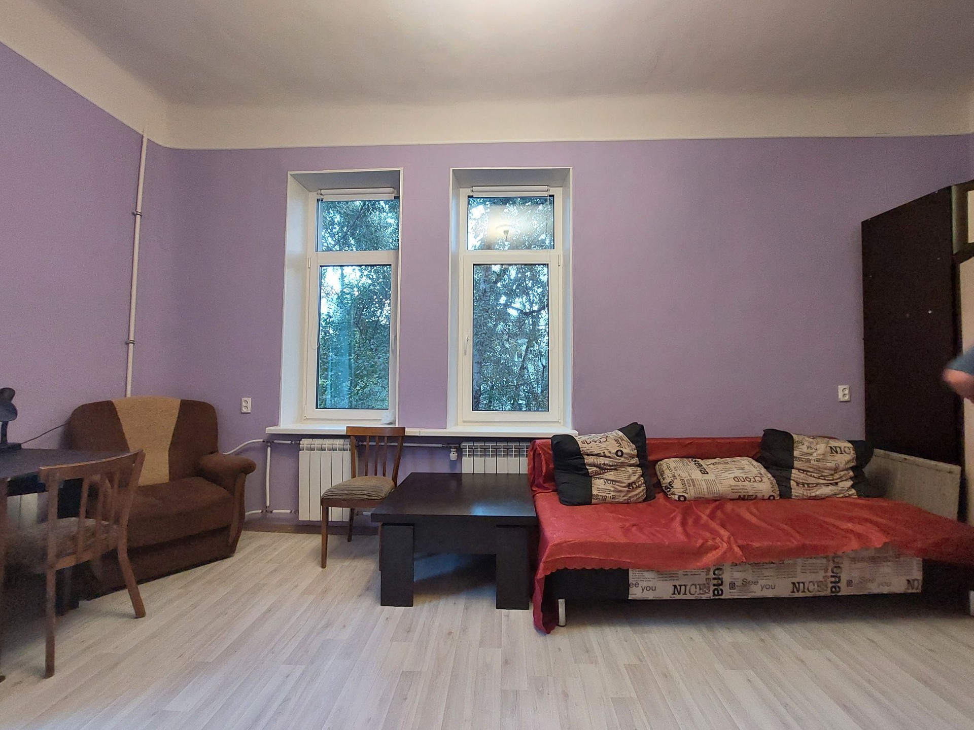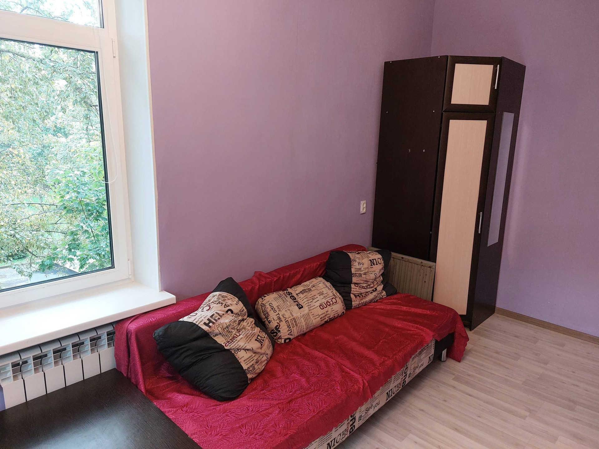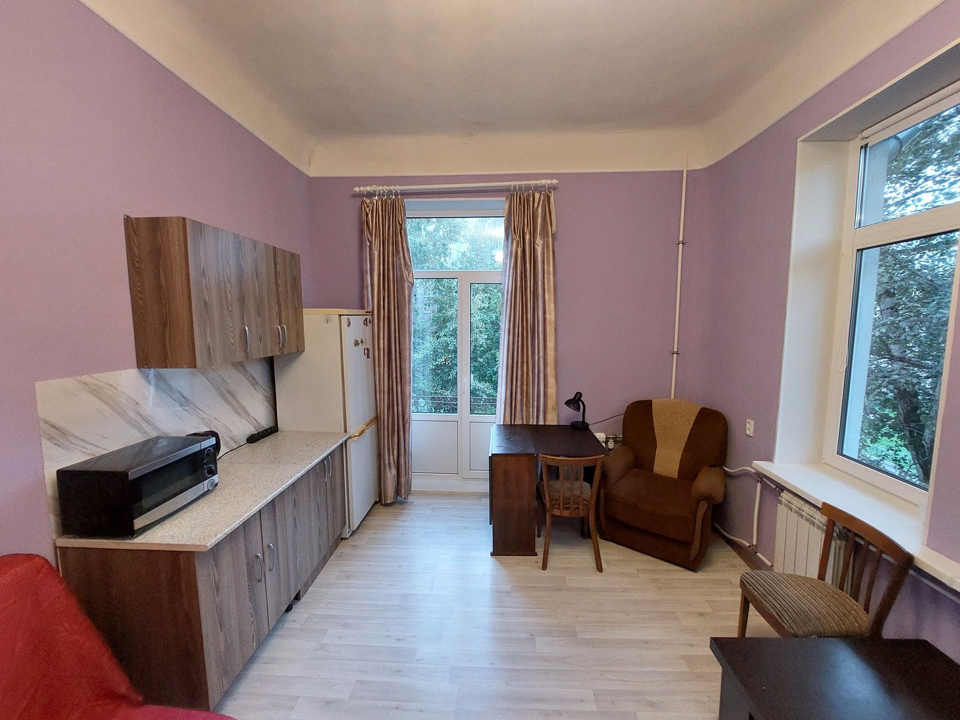 Сдам большую , уютную комнату 22.3 м2 с балконом. Есть вся необходимая мебель для проживания .  Холодильник, стиральная машина, микроволновка , чайник , 2 дивана , шкаф , стол , стулья , кухонный гарнитур. Комната светлая, 3 окна, высокие потолки 3,2м.