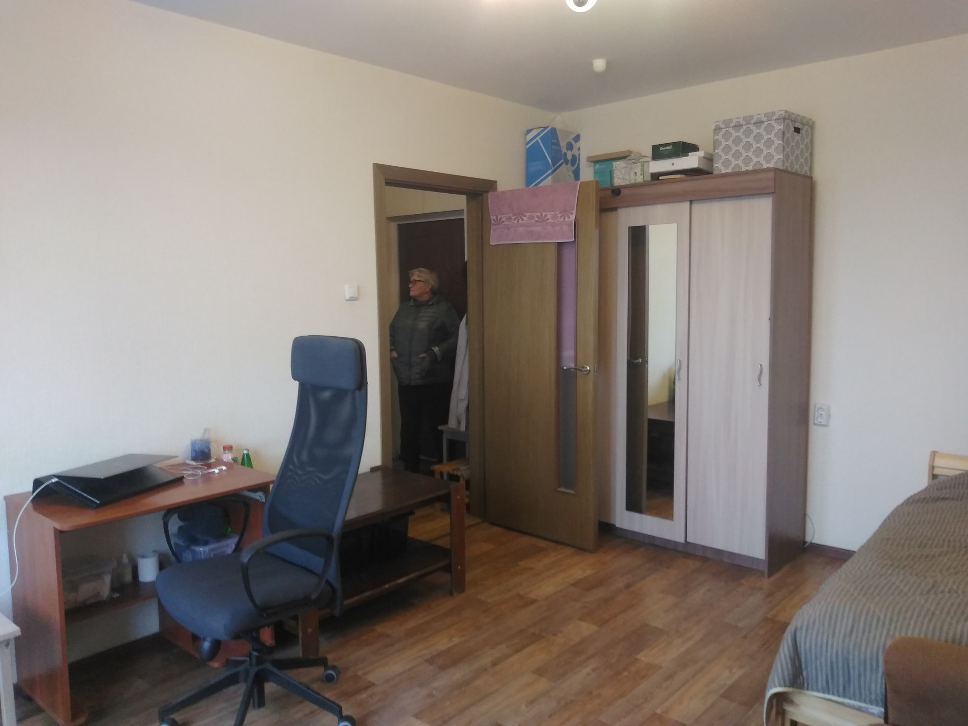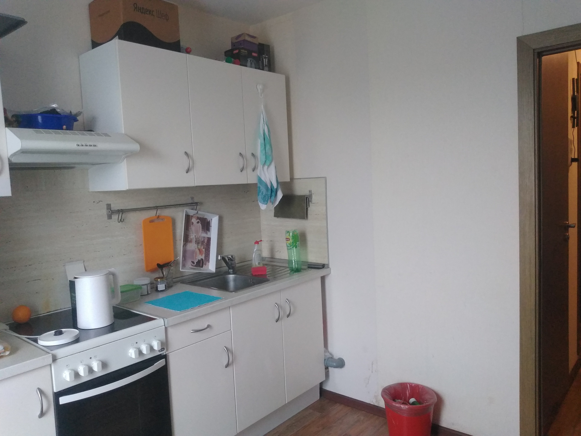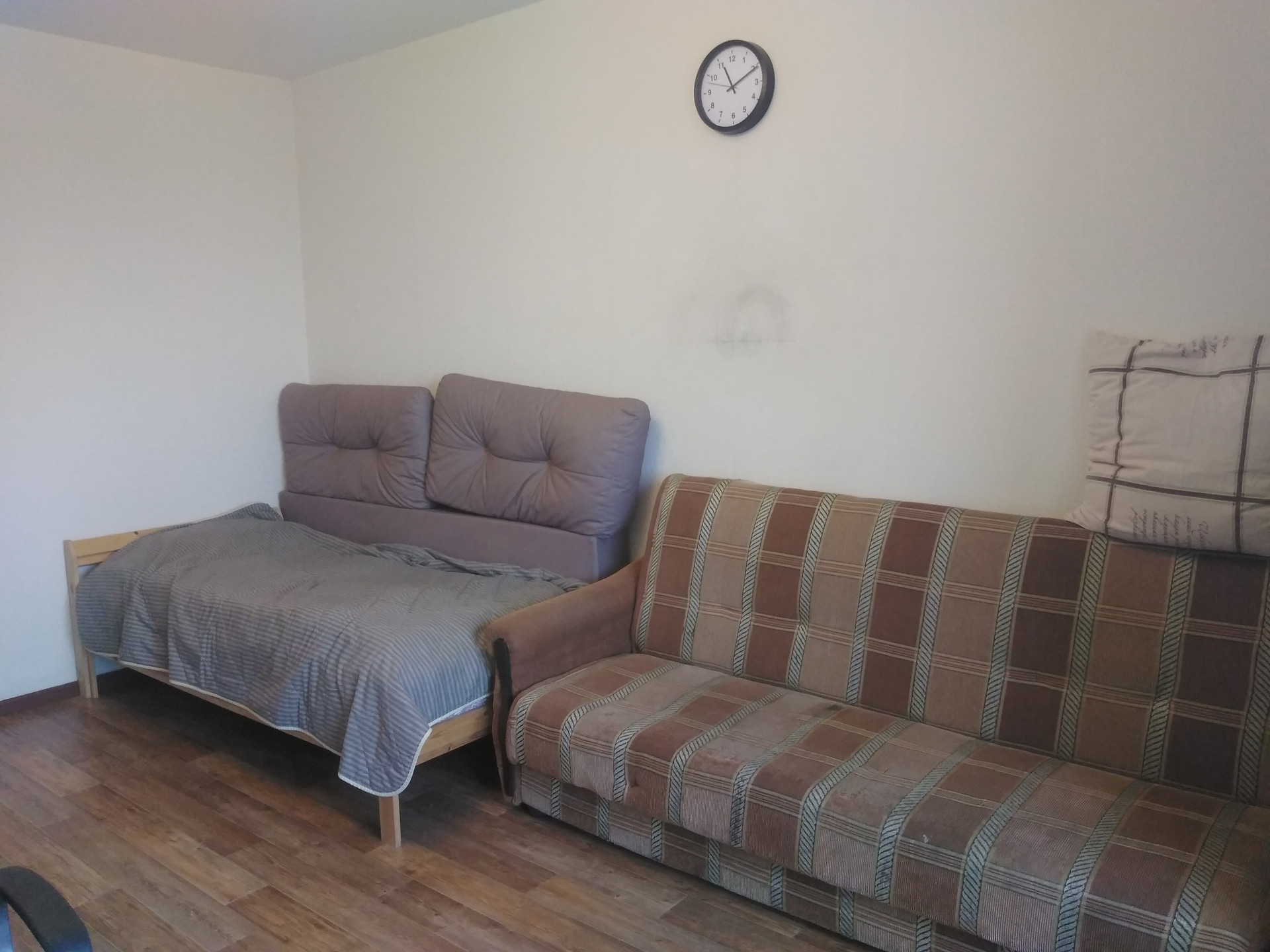 Кухня оборудована. В комнате необходимый минимум мебели.