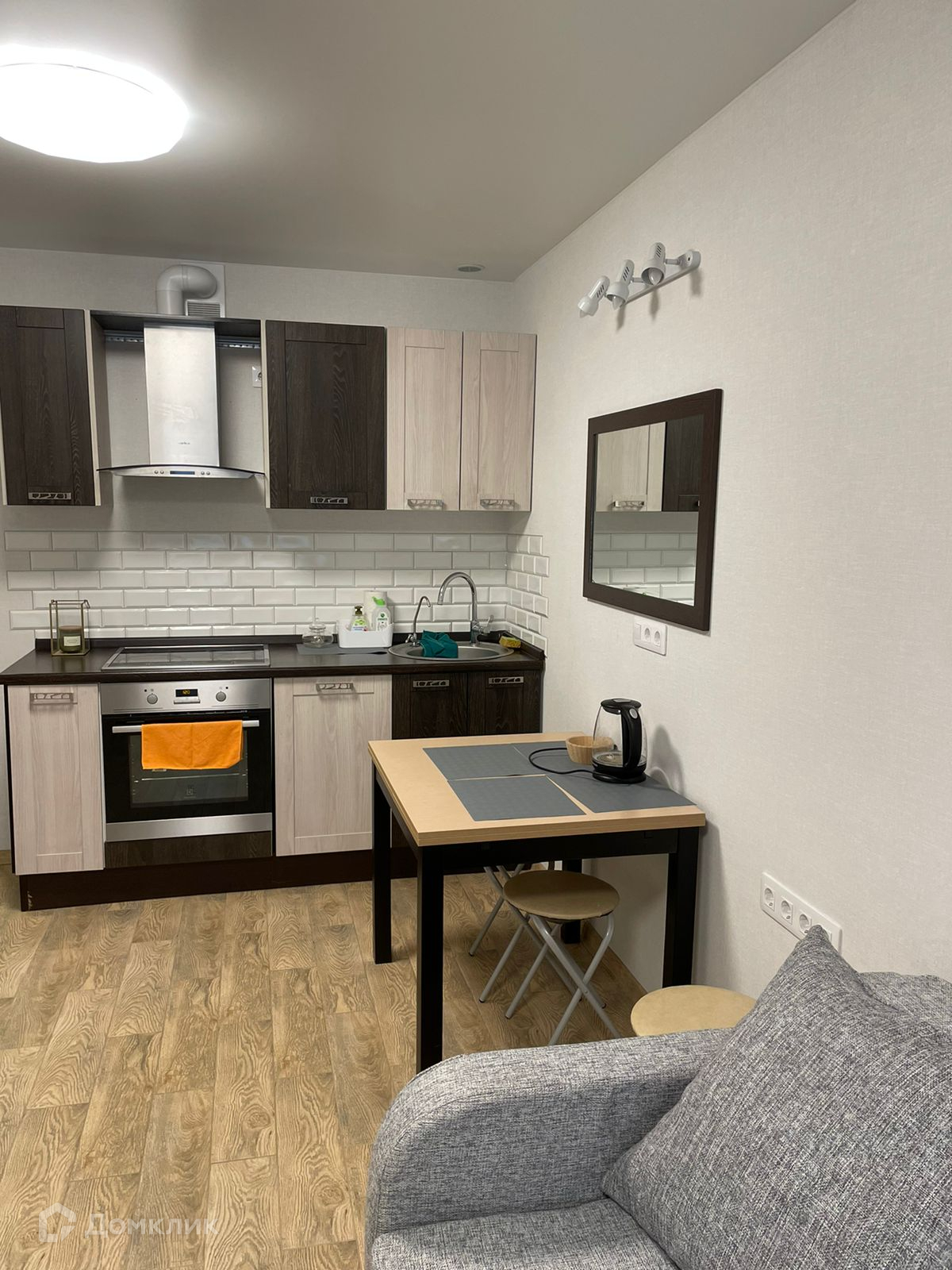 В квартире-студии имеется диван,кухонный гарнитур,плита,духовой шкаф,холодильник, стиральная машина, чайник.Квартира-студия оснащена тёплыми полами.