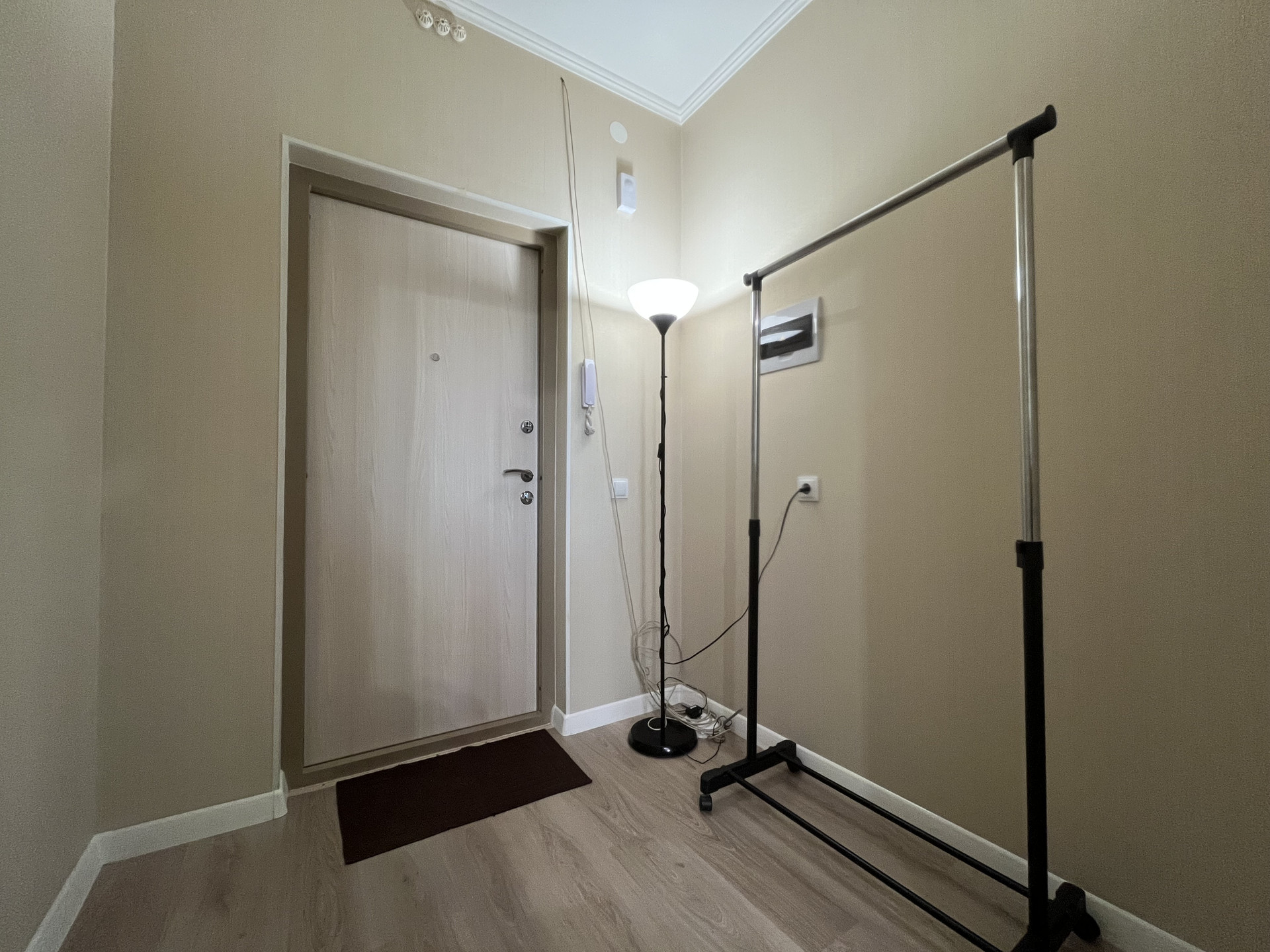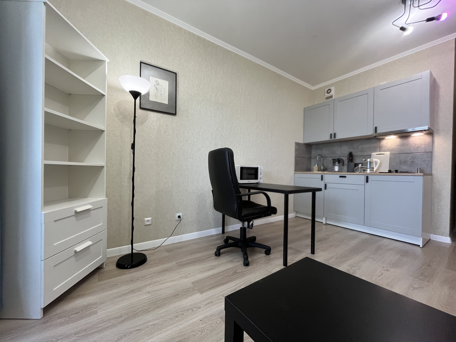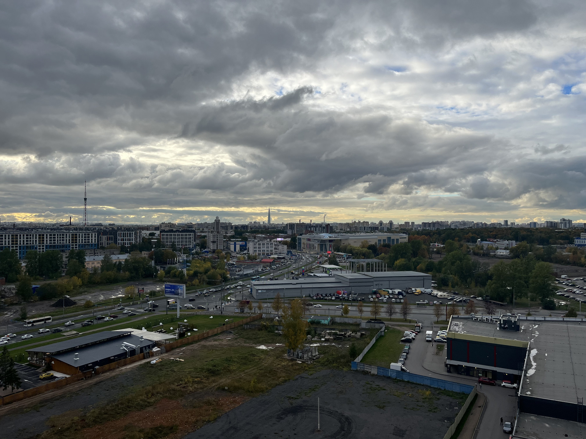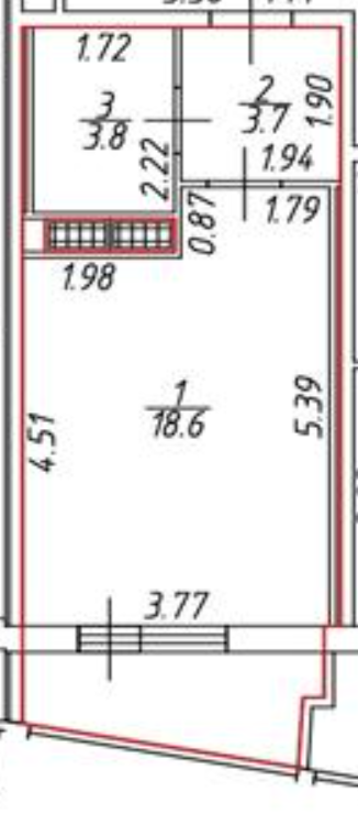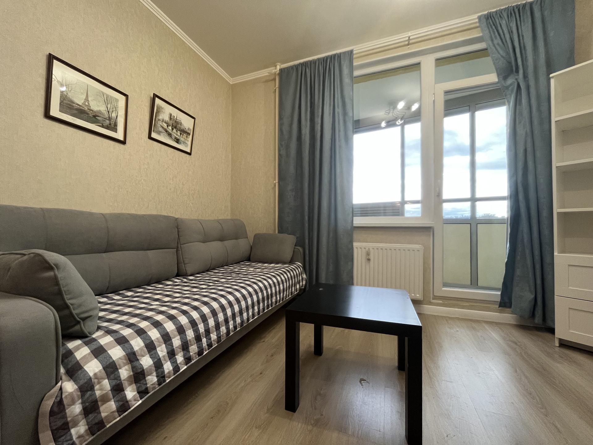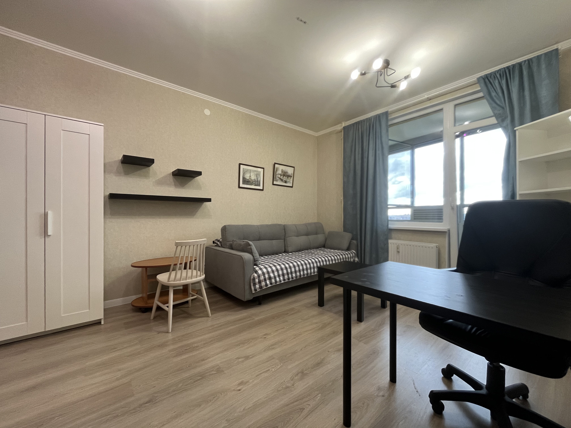 Общая площадь 27,5 м2, комната 18.6 м2 с прилегающей лоджией 3,5 м2. Из окон открывается завораживающий вид на город, видно Лахта-башню, стадион, телебашню - вид действительно шикарный, особенно вечером, когда загораются огни.