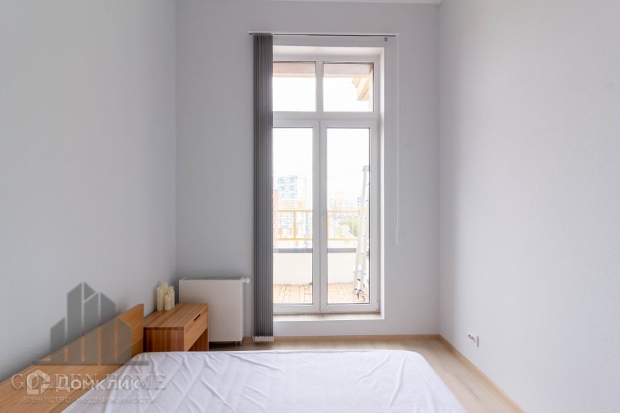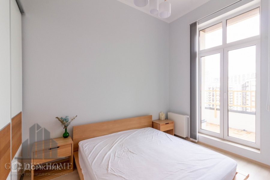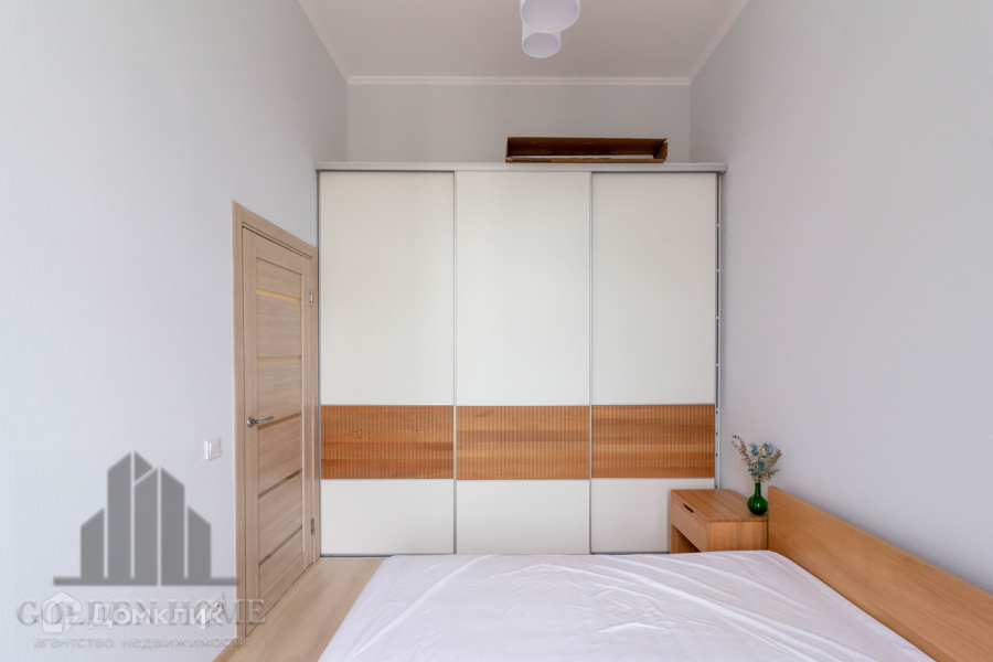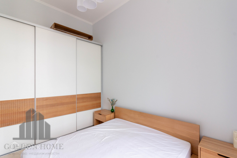 Спальная комната укомплектована двуспальной кроватью с ортопедическим матрасом и местами для хранения вещей.