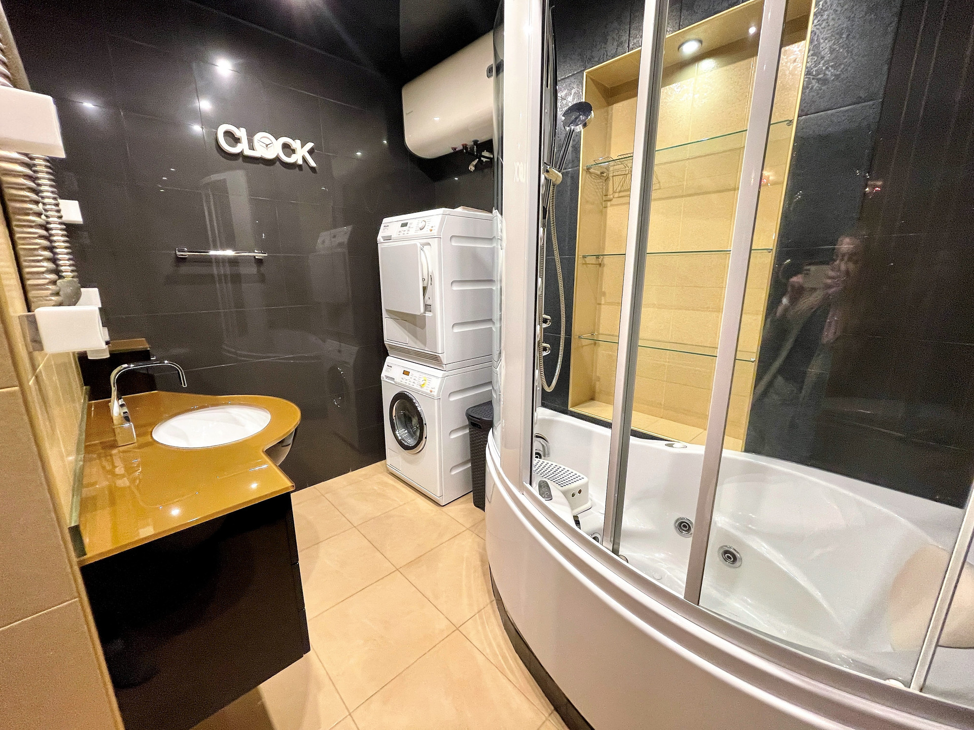 •    Два сан. узла с бойлерами, стиральной и сушильной машинами. Все помещения оборудованы кондиционерами, проведен интернет.